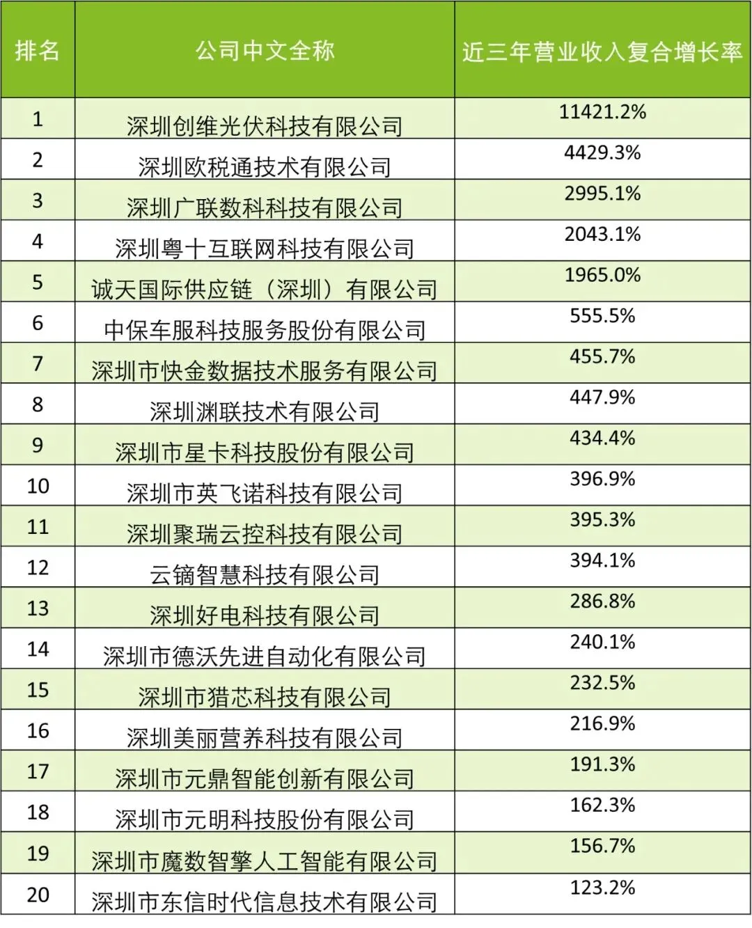 荣登“深圳20强”四甲的企业分别是:深圳创维光伏科技有限公司、深圳欧税通技术有限公司、深圳广联数科科技有限公司、深圳前海粤十信息技术有限公司。“深圳20 强”企业近三年营业收入复合增长率平均达1443.16%,中位数为396.10%。入选“深圳明日之星”的企业共有30家,其中近半为软硬件行业企业,其余涵盖生命科学、互联网、新能源等高技术企业。深圳 20 强企业将自动成为德勤中国 50 强及亚太 500 强项目的候选企业,深圳明日之星企业将自动成为德勤中国明日之星候选企业。