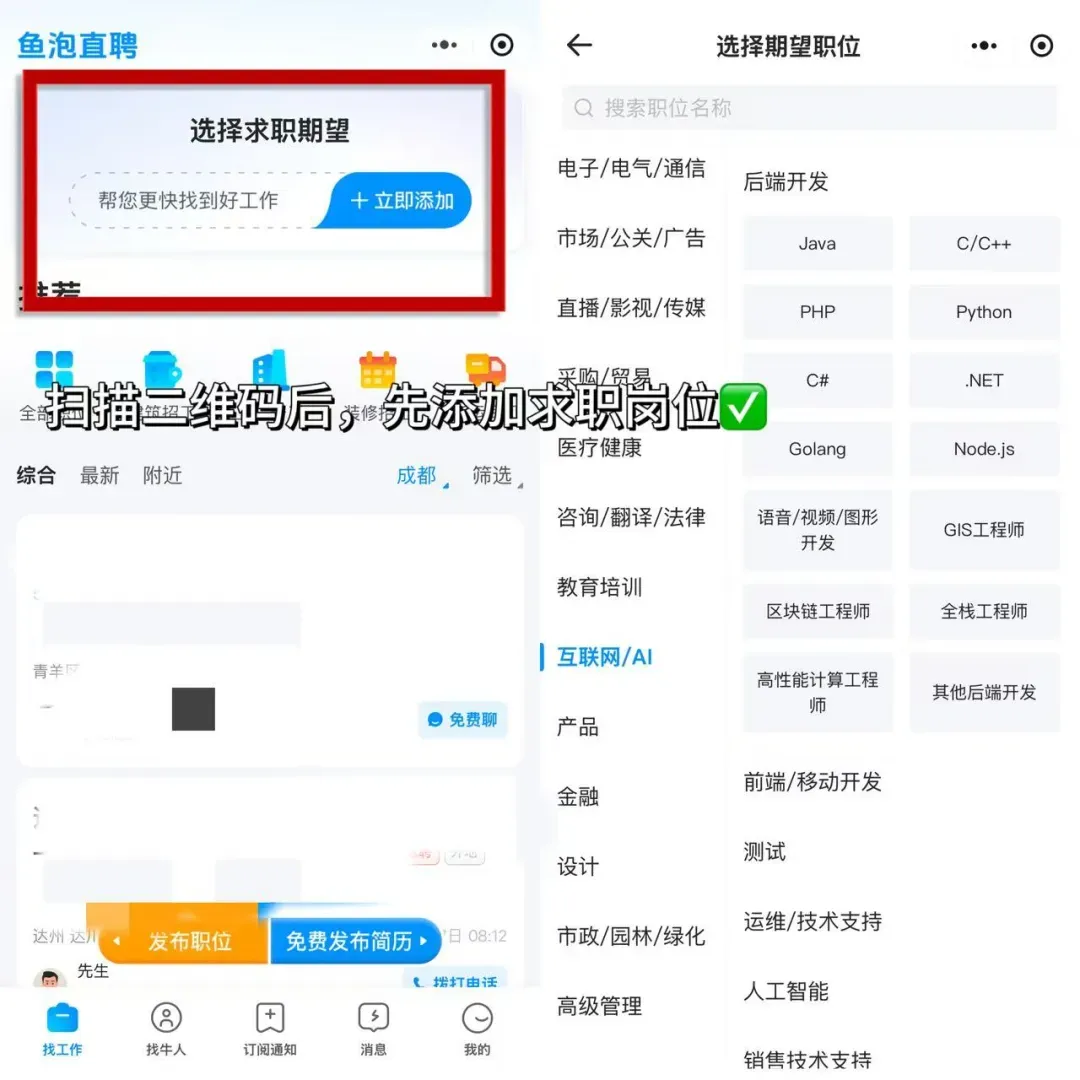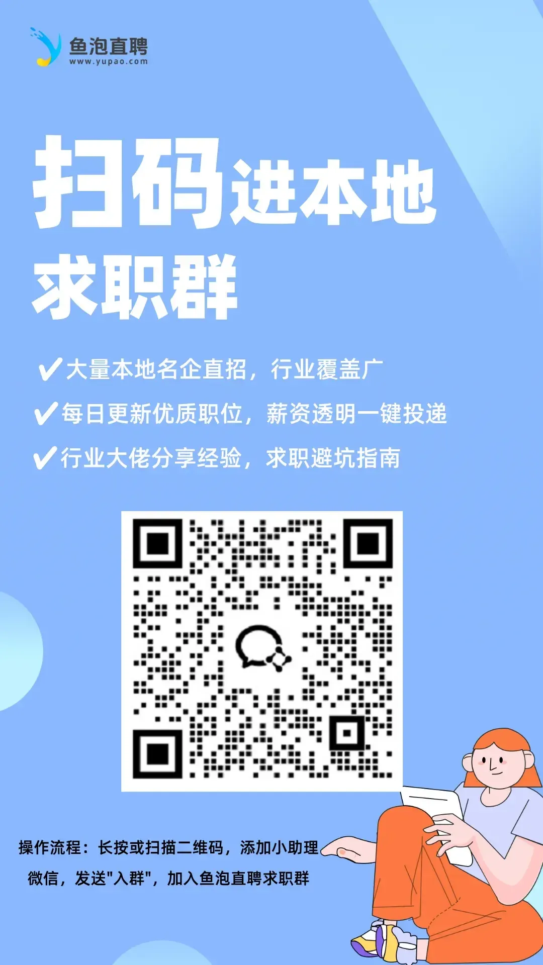 长按或扫描下方二维码,添加小助理微信,发送“入群”,加入鱼泡直聘求职群,与同行伙伴共享资源、互助成长!