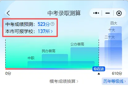 这时候,不放借助教育排排网的录取测算功能。只要输入孩子分数,即可一键测算可报考的高中范围。