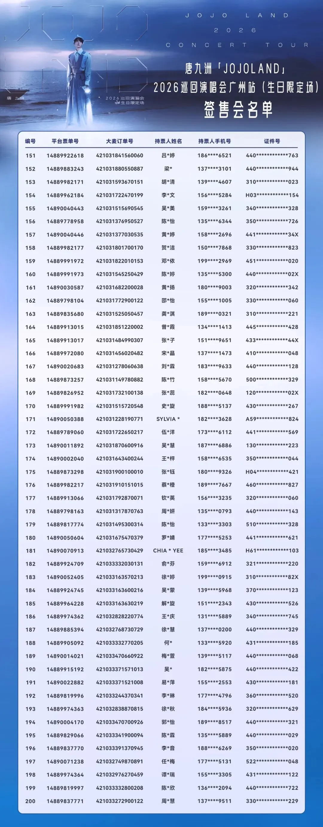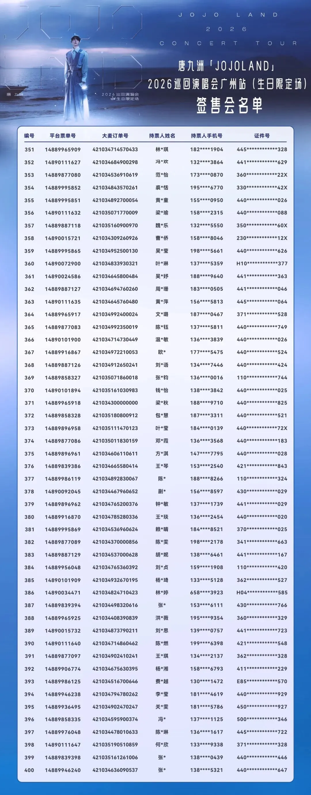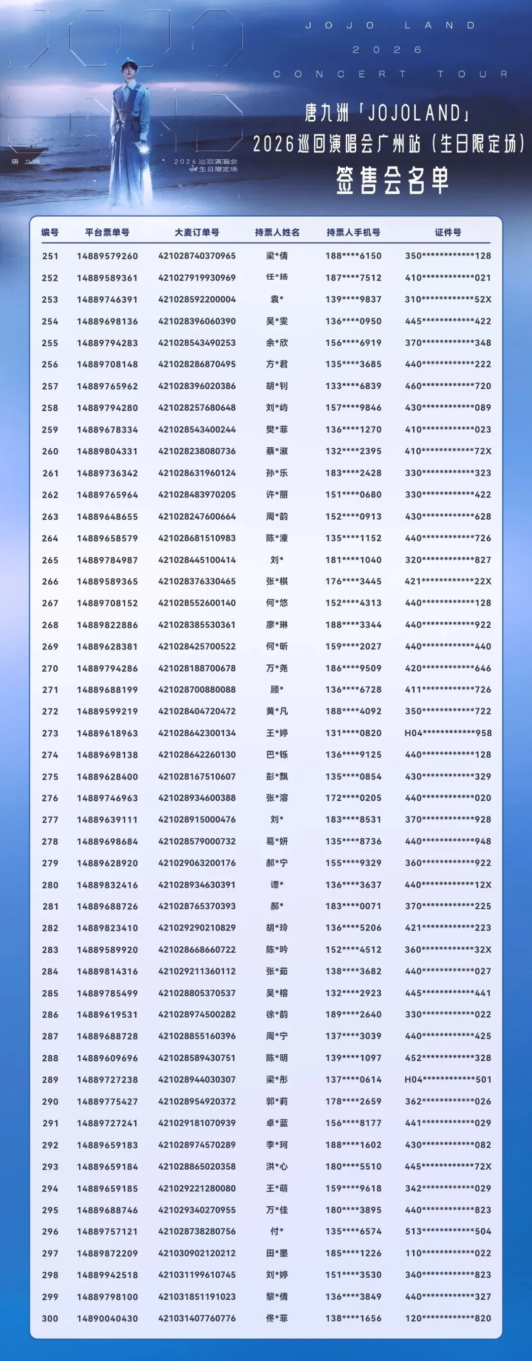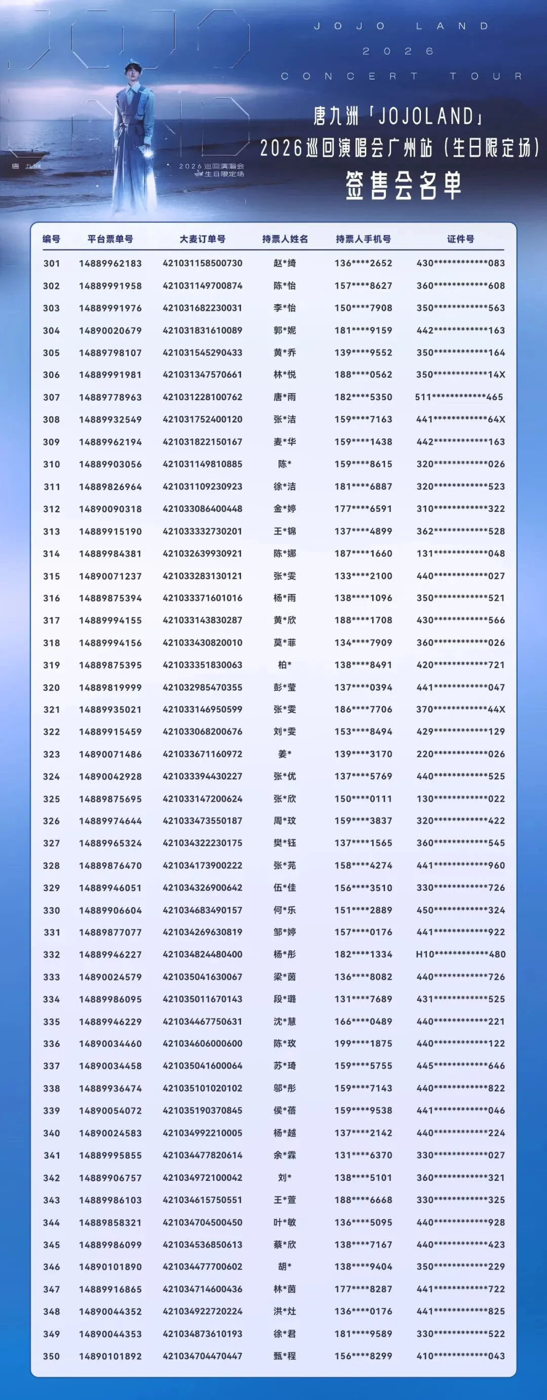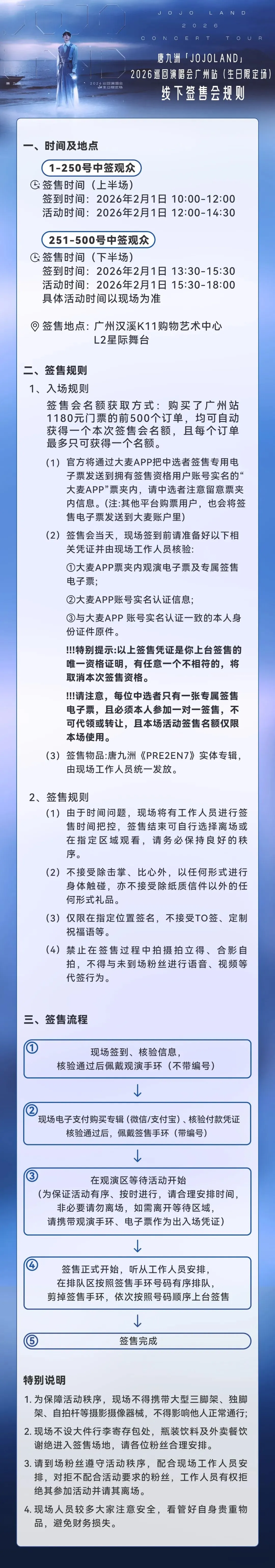 线下签售会中选名单来啦!详细信息请查看下方长图🔖📍签售地址:广州汉溪K11购物艺术中心L2星际舞台⏰签售时间:2026年2月1日 12:00-14:30(上半场,1-250号中签观众)2026年2月1日 15:30-18:00(下半场,251-500号观众)💽签售物品:唐九洲《PRE2EN7》实体专辑(由现场工作人员统一发放)⚠️注:中选名单序号为本次签售入场顺序‼️更多签售规则请泡泡们仔细阅读下方规则长图~恭喜中选的500位粉丝,期待2月1日与大家线下相见~