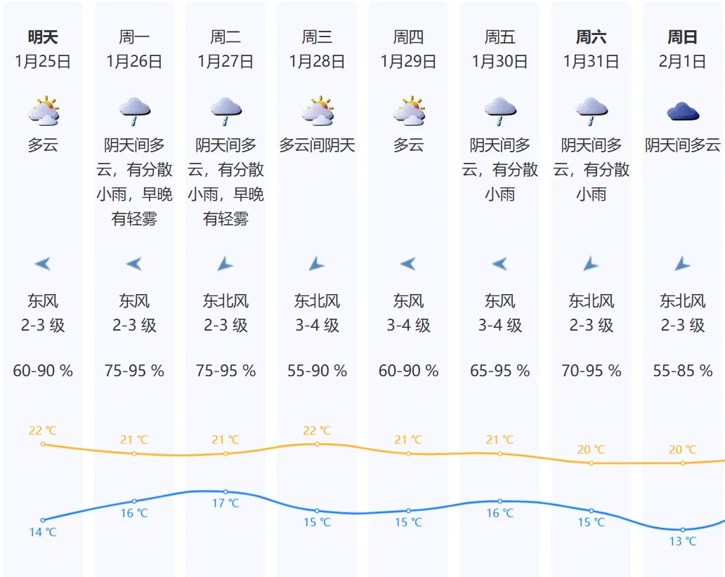 1月26~1月27日云量增多,湿度加大,间中有小雨,气温继续回升,早晚有轻雾或雾,有出现轻微回南天的可能;展望1月28~1月29日多云间阴天。