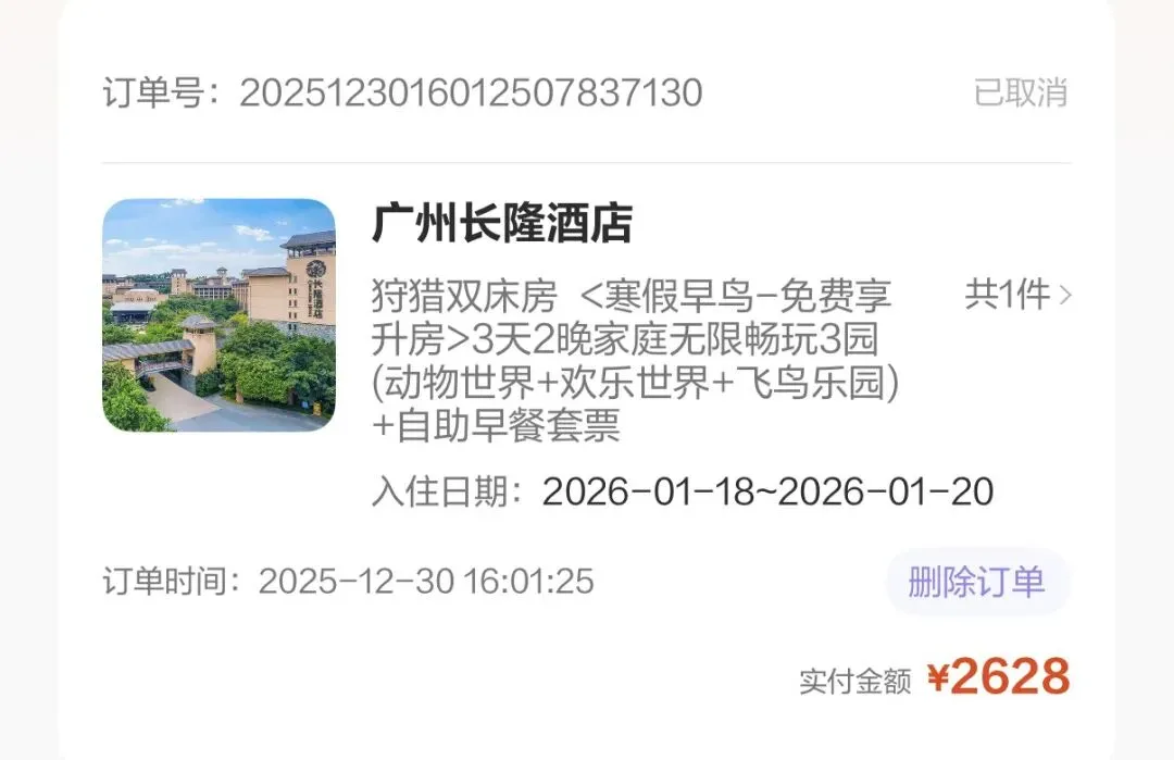 我说你们的系统问题为什么需要作为消费者的我承担后果?长隆APP、长隆酒店前台工作人员都表示互相不了解对方的业务,需要我自己沟通,面对APP上明晃晃的大红字“实付金额2628”,他们指着右上角很难被察觉的小号灰字“已取消”和我说,他们也没办法,查不到预定记录,只能按当时5088元2晚且不包含早餐的价格入住。