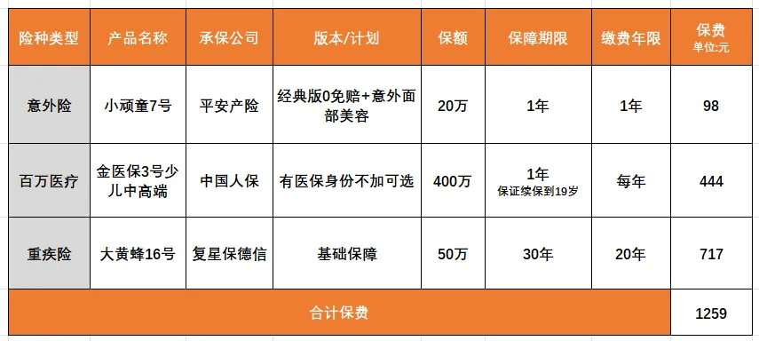 很多妈妈问“预算有限怎么配”,我按每月105元、306元做了两套方案,适配不同家庭,假设被保人是8岁女娃,产品可根据需求灵活调整。