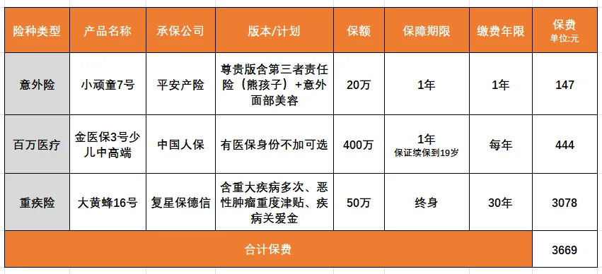 1、优先选不限社保范围、0免赔、100%报销、带伤残赔付的产品;2、根据监管规定,10岁以下儿童身故保额不超过20万,10-17岁不超过50万。所以,之前我看到很多朋友的平安福,主险身故责任31万,还配一份附加寿险10万,假如孩子10岁前身故,即便花了保费也赔不到足额。2. 医疗险:金医保3号少儿版中高端——兜底大额医疗开销