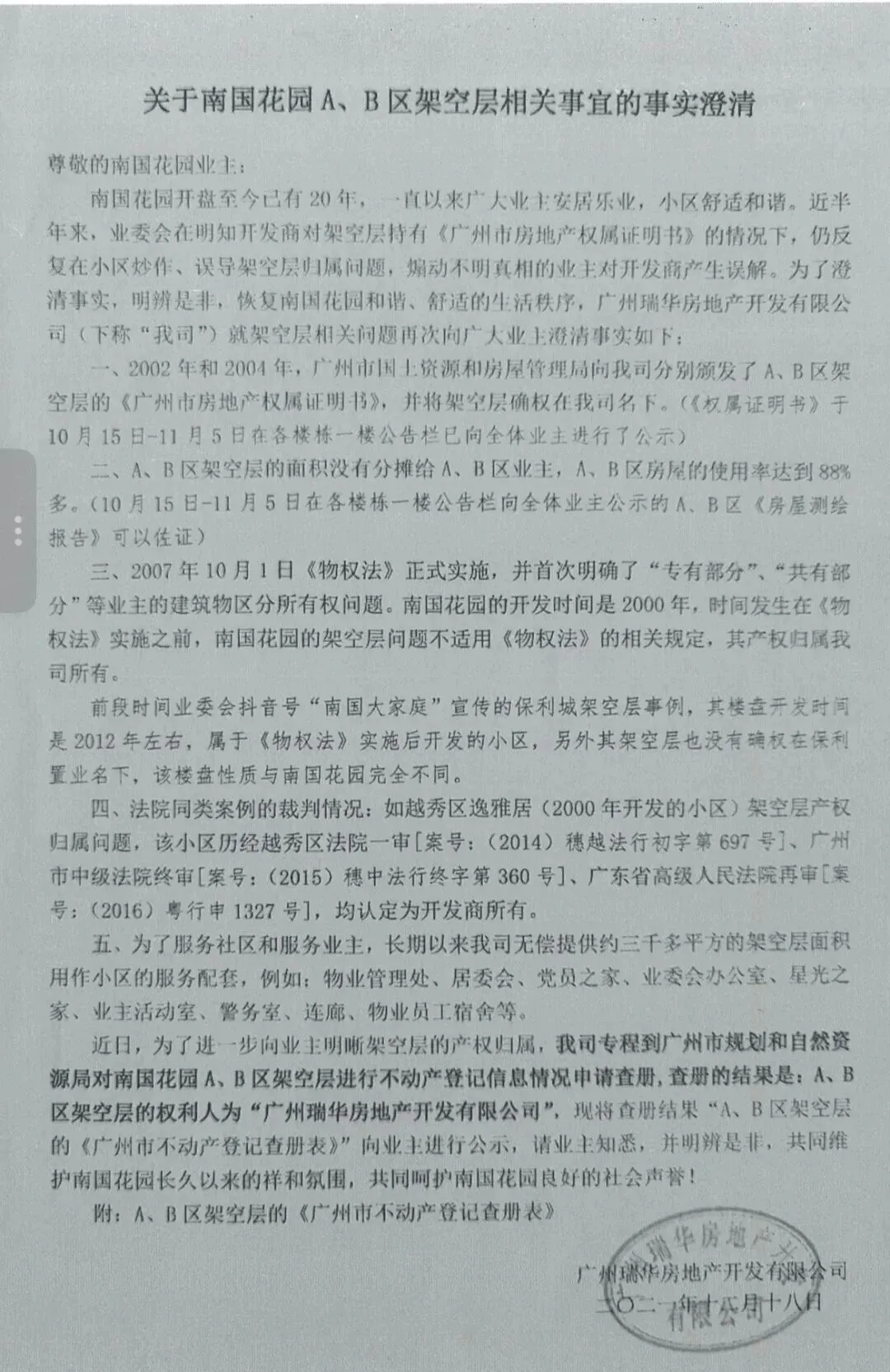 近日,广州市天河区人民法院合并审理了两起由南国花园业主委员会提起的侵权责任纠纷案,将小区内纷争多年的架空层与夹层归属问题,彻底推至台前。两起案件,索赔金额超过2000万元。据了解,小区开发商在2021年发布的《关于南国花园 A、B区架空层相关事宜的事实澄清》中,主张小区A、B区架空层为其单独所有。主要理由是A、B区架空层在2002年和2004年已由政府颁发《权属证明书》,完成确权。2007年10月1日《中华人民共和国物权法》(以下简称《物权法》)正式实施,并首次明确了“专有部分”“共有部分”等业主的建筑物区分所有权问题。南国花园的开发时间是2000年,时间发生在《物权法》实施之前,南国花园的架空层问题不适用《物权法》的相关规定;法院同类案件裁判情况亦认定类似的架空层属于开发商所有。但业委会并不接受上述主张。