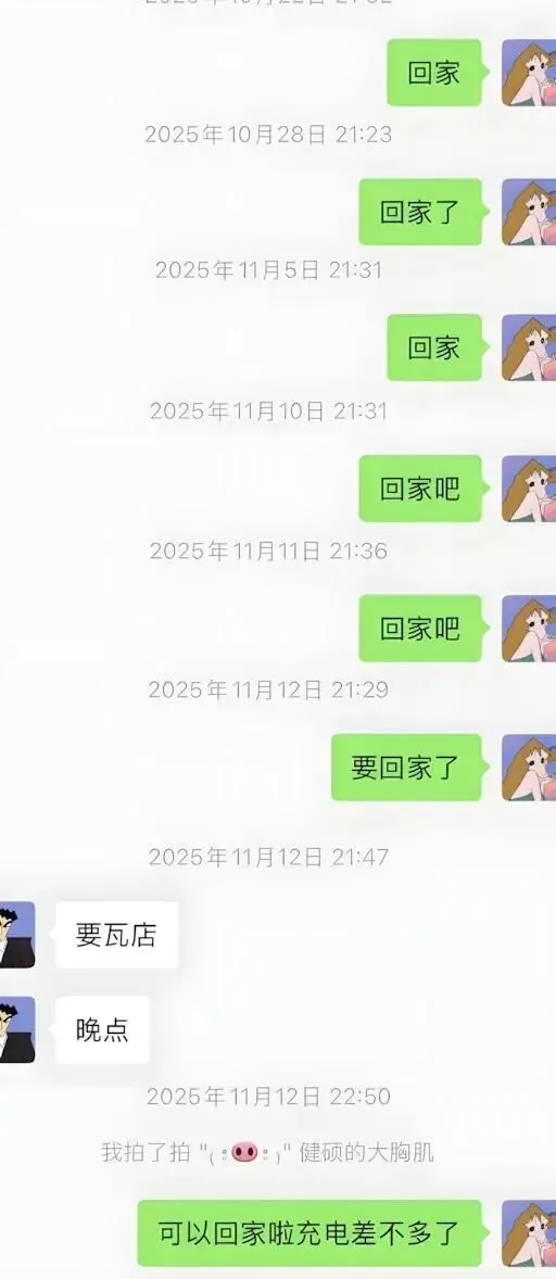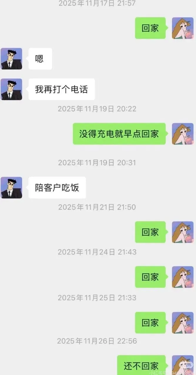 妻子晒出的聊天记录里,是日复一日的加班日常,去年十月份开始,他几乎每天都在加班,有时候甚至加班到凌晨两点多才到到家,去年10月份的时候,他还能抽出时间来给妻子回复几句,到11月份的时候,在收到妻子催他回家的信息的时候,他连回复妻子的时间都很难抽得出来了。