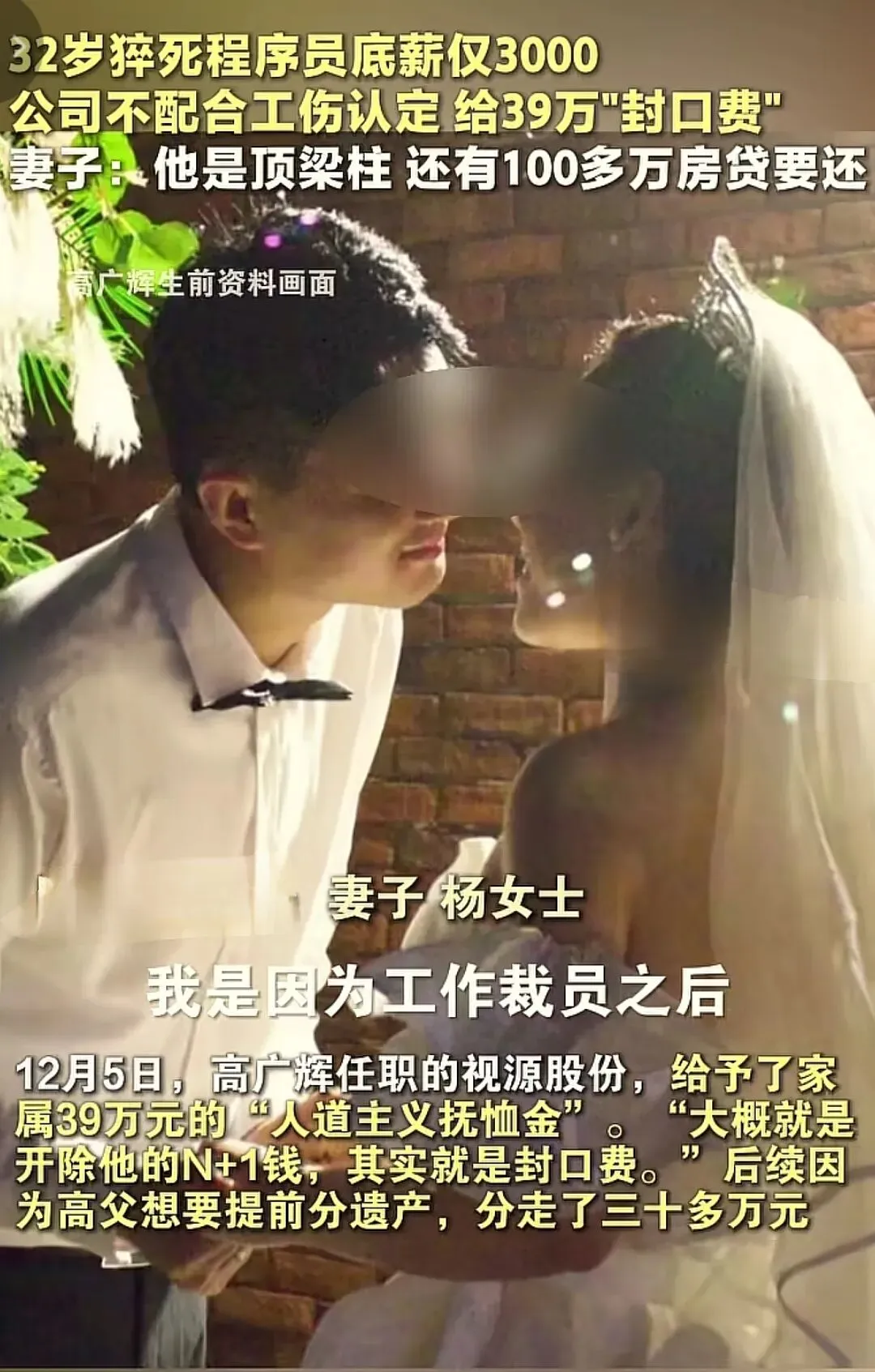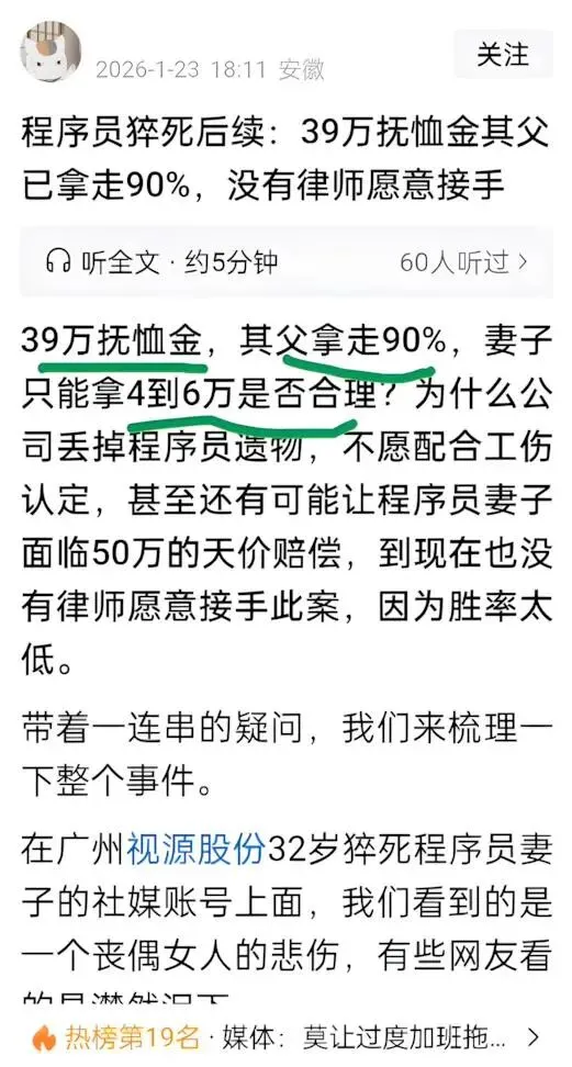 这个事情也提醒大家,经常熬夜加班的工作千万不要做,有再多的钱也不要做,又或者做个一两年钱赚够就换工作。不然你的存款,抚恤金,漂亮老婆和孩子都不再是你的,命最重要!
