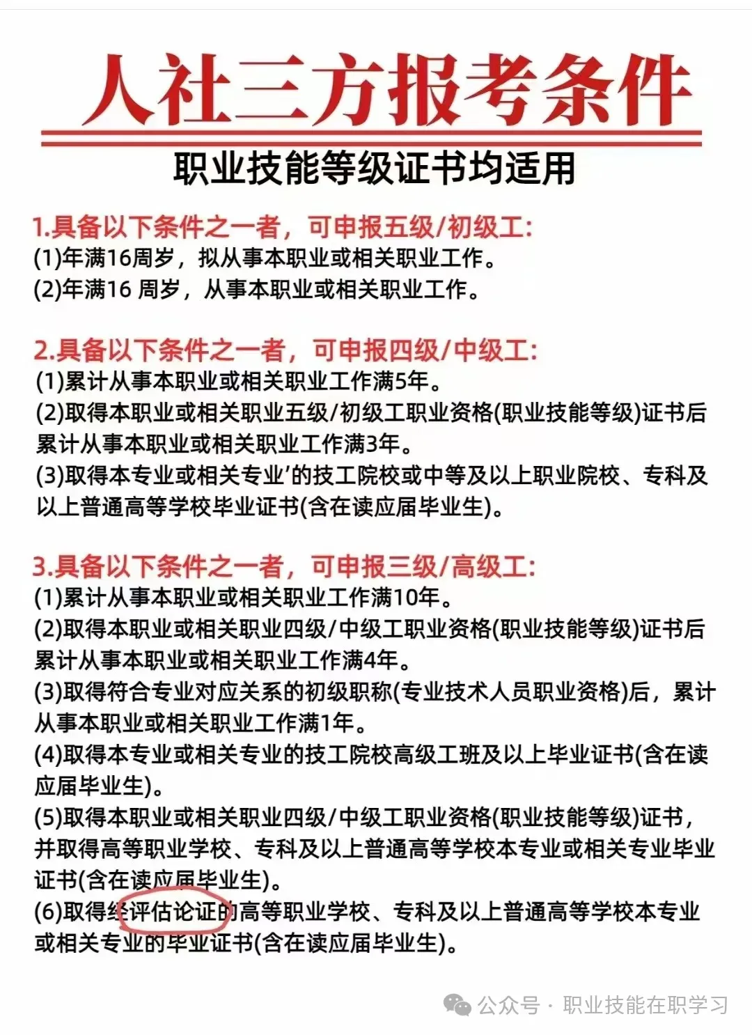 (3)取得技工学校本专业或相关专业毕业证书(含尚未取得毕业证书的在校应届毕业生);或取得经评估论证、以中级技能为培养目标的中等及以上职业学校本专业或相关专业毕业证书(含尚未取得毕业证书的在校应届毕业生)。