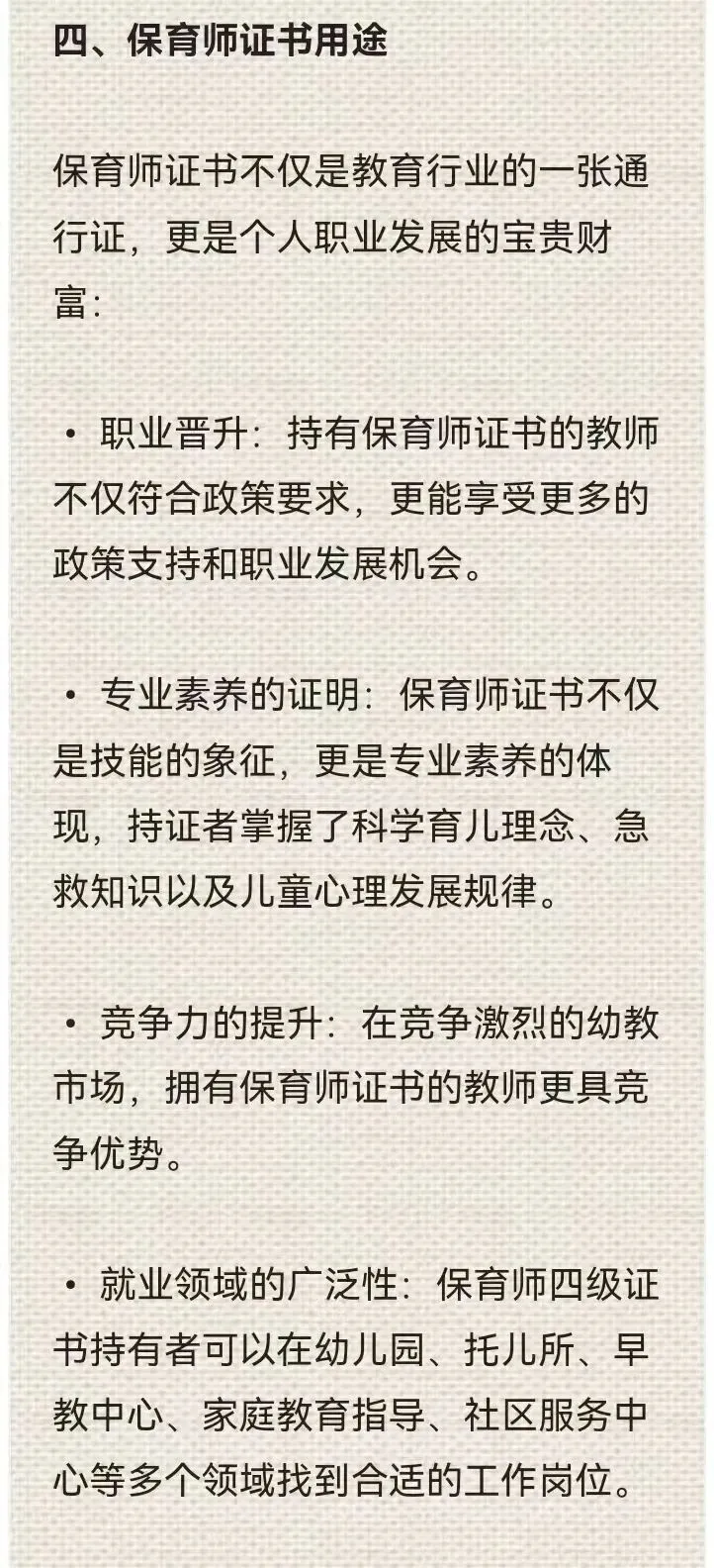 保育师证书作为专业资格的认证,对于提升个人职业素养、拓宽就业前景以及增强竞争力具有重要意义。在这个重视早期教育的时代,提升专业素养,握紧这张证书,你就能在教育的蓝海中畅游,开启属于你的璀璨篇章。