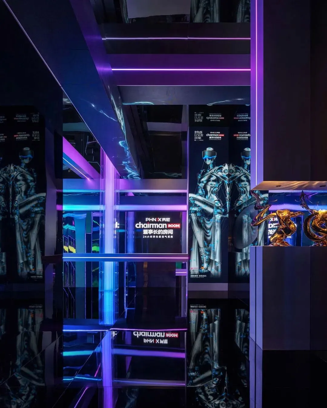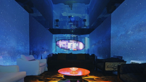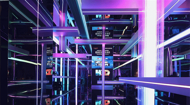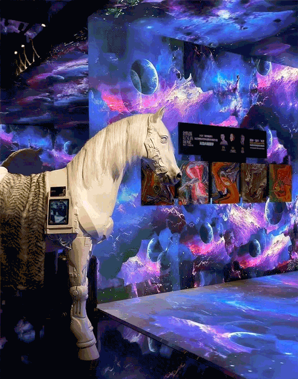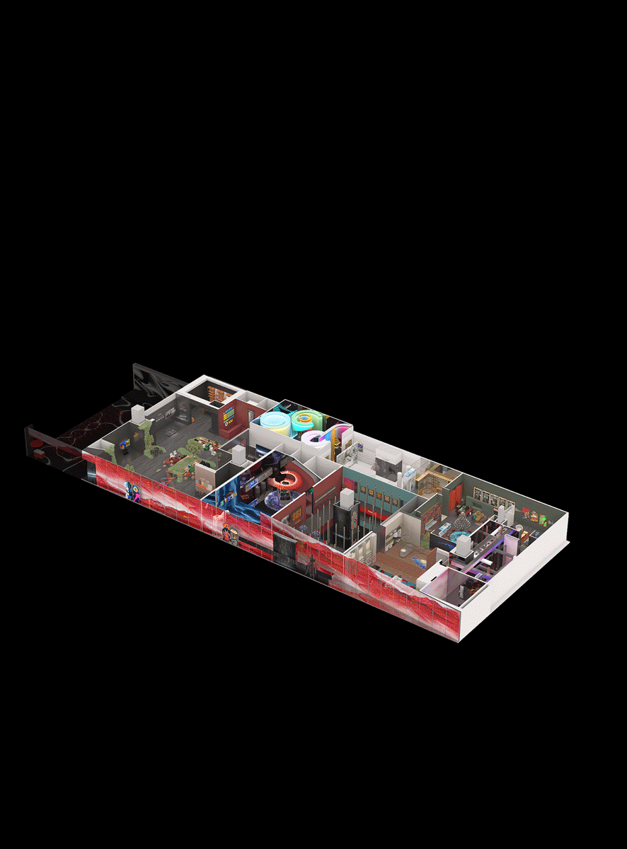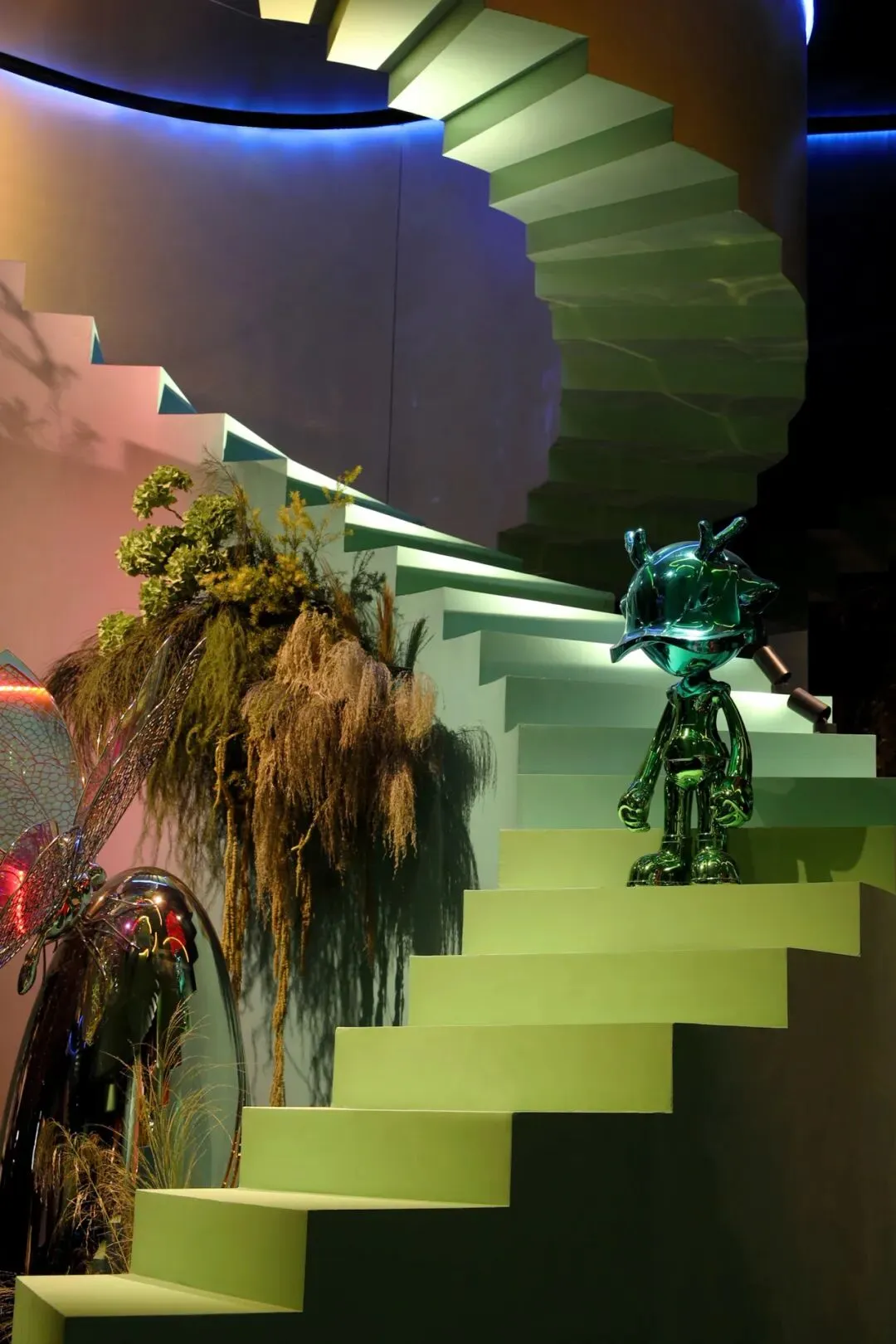 于此,美国邓恩涂料自然色彩,泼洒成一场流动的盛宴。旋转楼梯,链接着大地与穹顶。倒置的天顶,与黑镜中的无限映照,构成一个关于“寻找玫瑰”的莫比乌斯环。全景光设计与皓逸智能联袂,让三原色光在空间中有序流淌;唯雅艺术潮玩点缀其间,与之共舞。