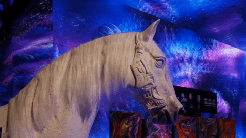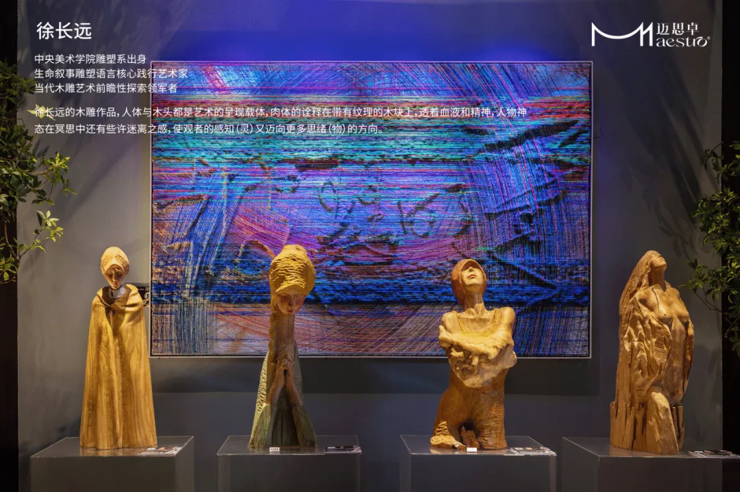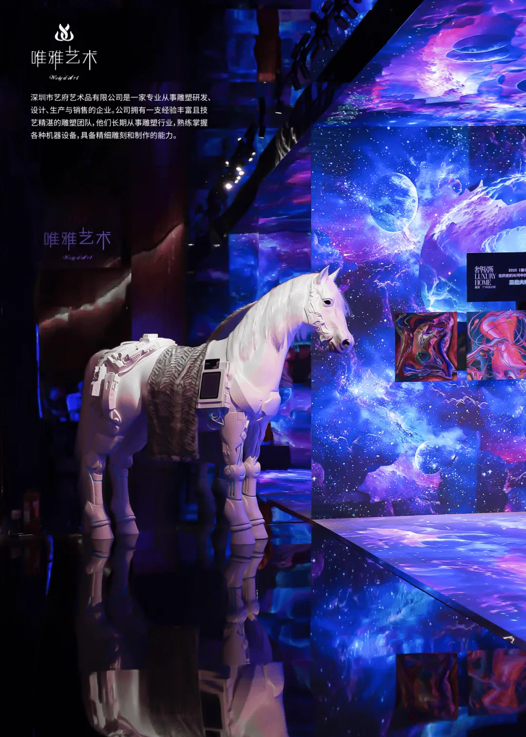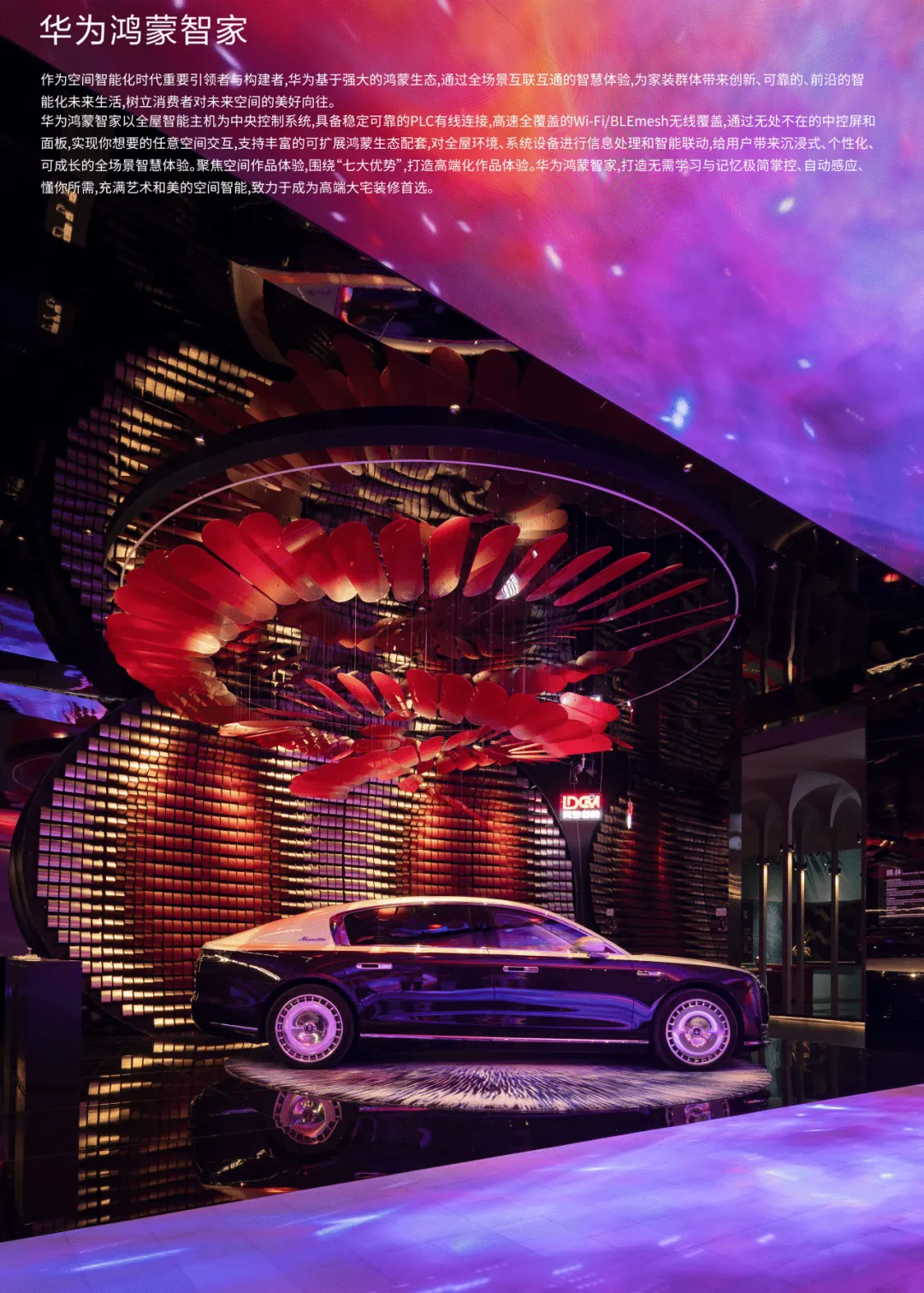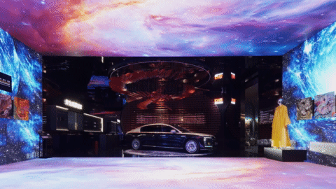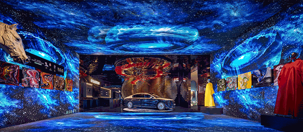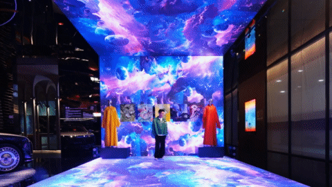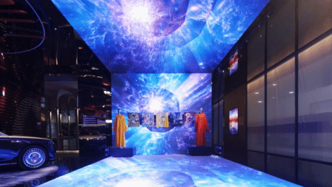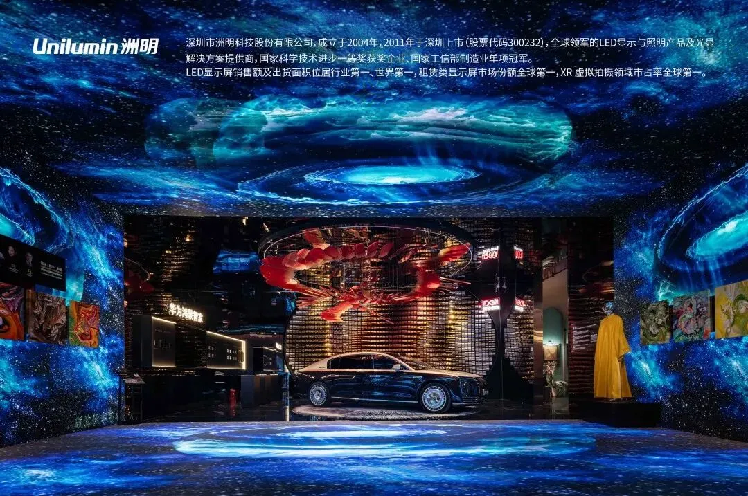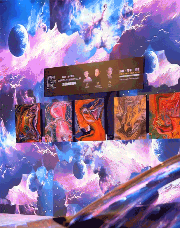 洲明LED屏构筑蓝色宇宙,顾林的色彩在侧跃动——形于无形,随彩意色,邀您步入光影交融之境。唯雅的白马静立角落,如同穿越时空的优雅信使;华为鸿蒙智家-尊界S800静泊于地球脉络之上,灵动的玫瑰如星子翩然迎候。从骏马到智驾,不变的,是向着归处的奔赴。