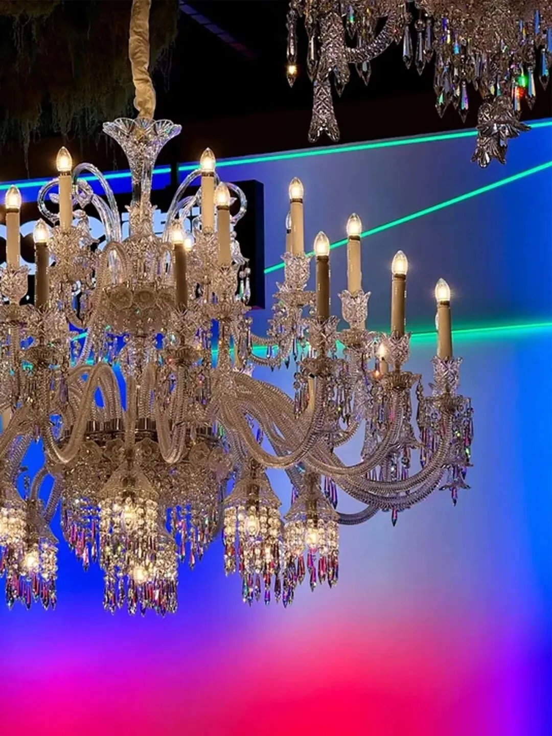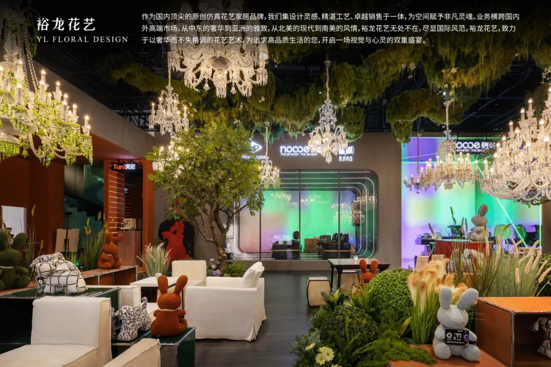 “寻奢拾遗,觅见玫瑰”之旅,终抵此域——艺术、设计与生活的交汇之地。天空绿意如瀑垂落,金枝玉叶的灯饰与全景光设计的光影共舞,将空间点染为星辰与萤火之境。