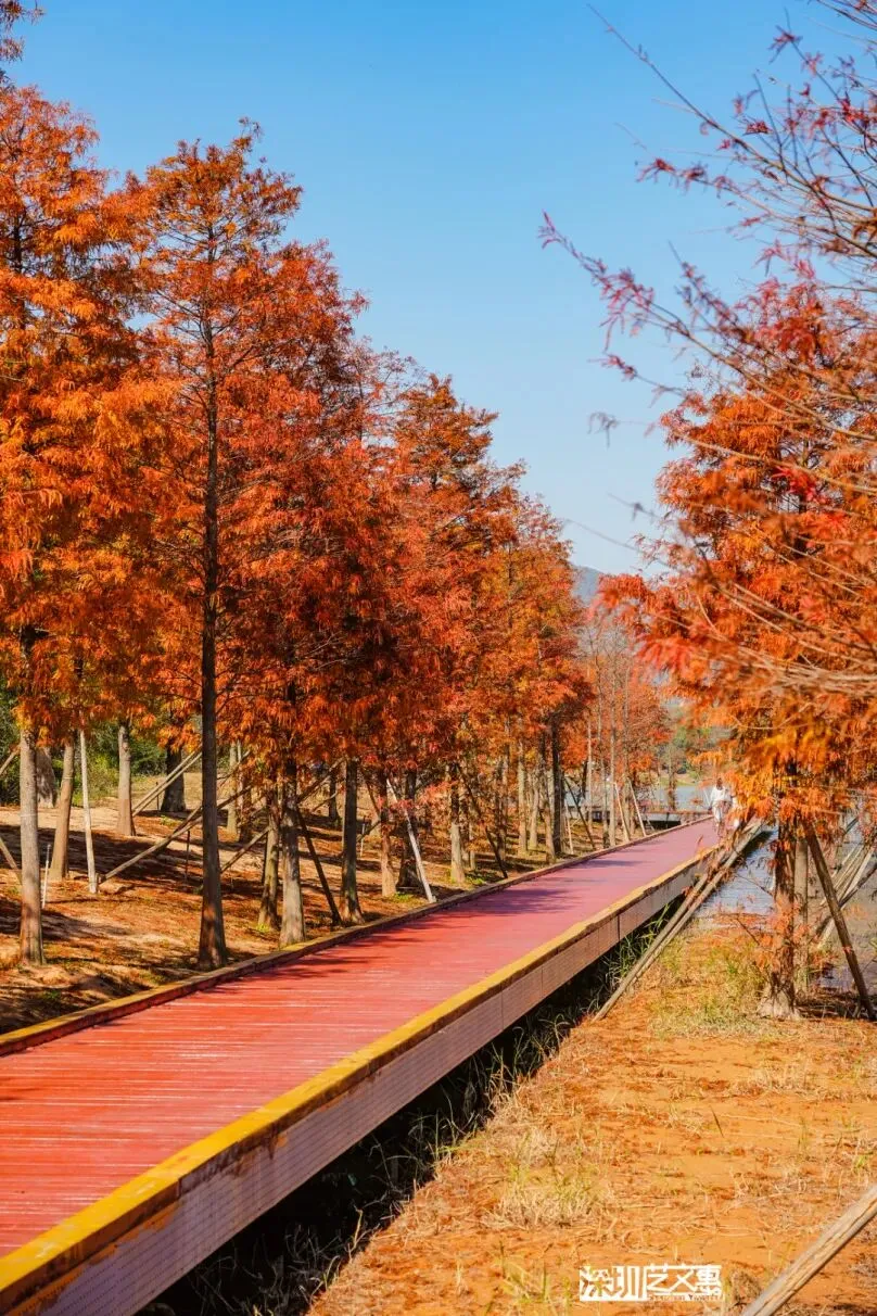 鹅公湾背靠苍翠群山,面朝澄澈如玻璃的海水。当阳光倾泻,近岸浅水区便泛出薄荷绿的幻彩光晕,通透如巨大的蓝宝石,随手一拍就是原图直出的朋友圈大片!图源:文旅深圳近岸礁石滩上,形态各异的礁石静卧其间,有的像拳头,有的像海狮,仿佛是大自然匠心独具的艺术品。沙滩边还有点缀着木质栈道和秋千栈道延伸向海,白天是清新文艺的取景框,日落时分则平添几分浪漫。图源:文旅深圳 在深圳的公园、湖边,落羽杉正用渐变色的羽叶,把冬天调成暖洋洋的油画模式~深圳人的新晋“网红”打卡地——九围湿地公园,是鲲鹏径第二段的特色景观。在绝美的杉林和水上栈道,随手一拍就是氛围感大片。