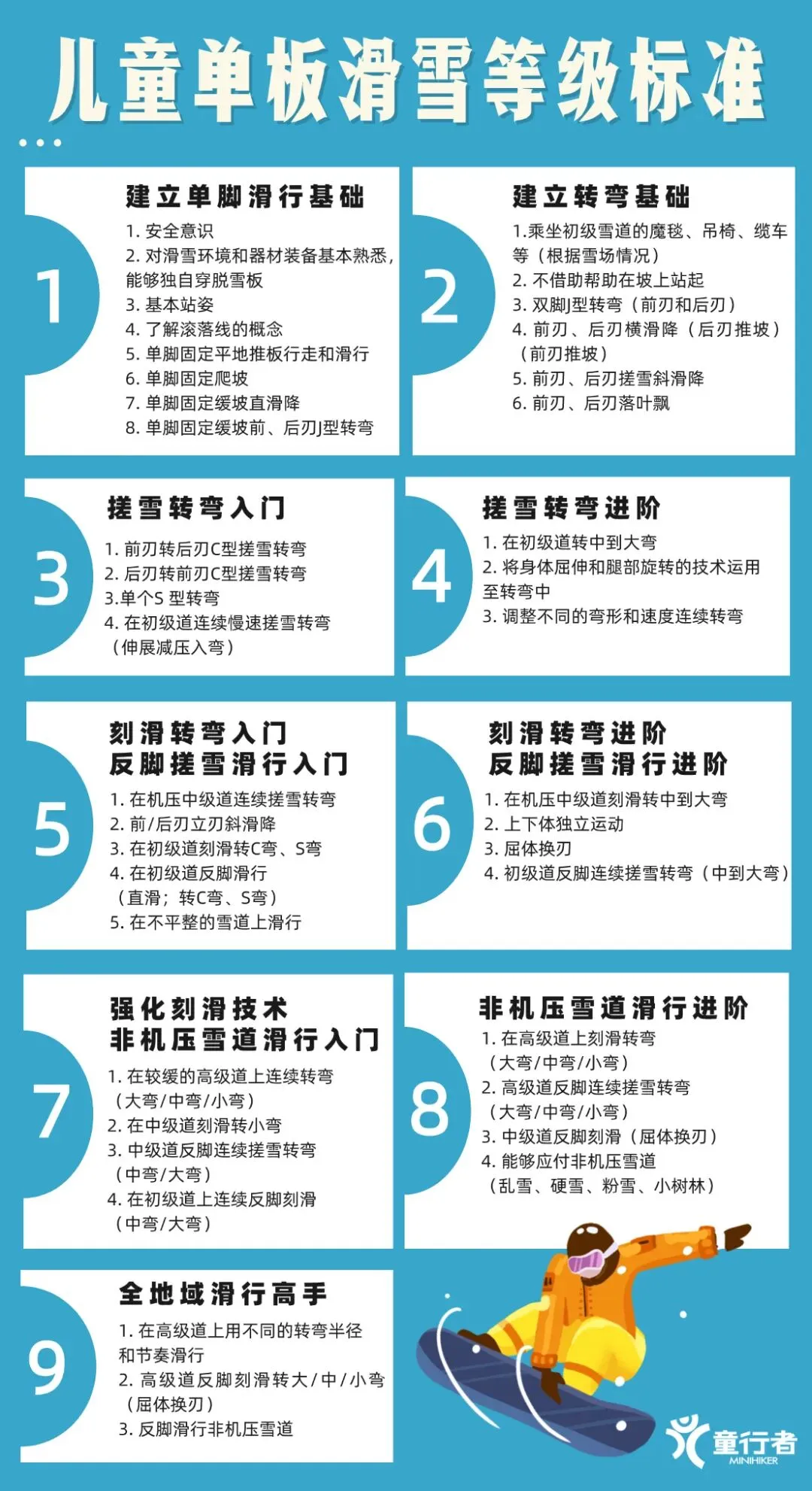 A:我们在雪场统一提供雪板、固定器、雪靴、雪杖、头盔,孩子需要自行准备雪服、雪镜、滑雪手套和护脸等;单板的孩子需要另外准备护具:护肘、护臀、护膝三件套。具体的物品清单我们会在开营前建群发给大家。