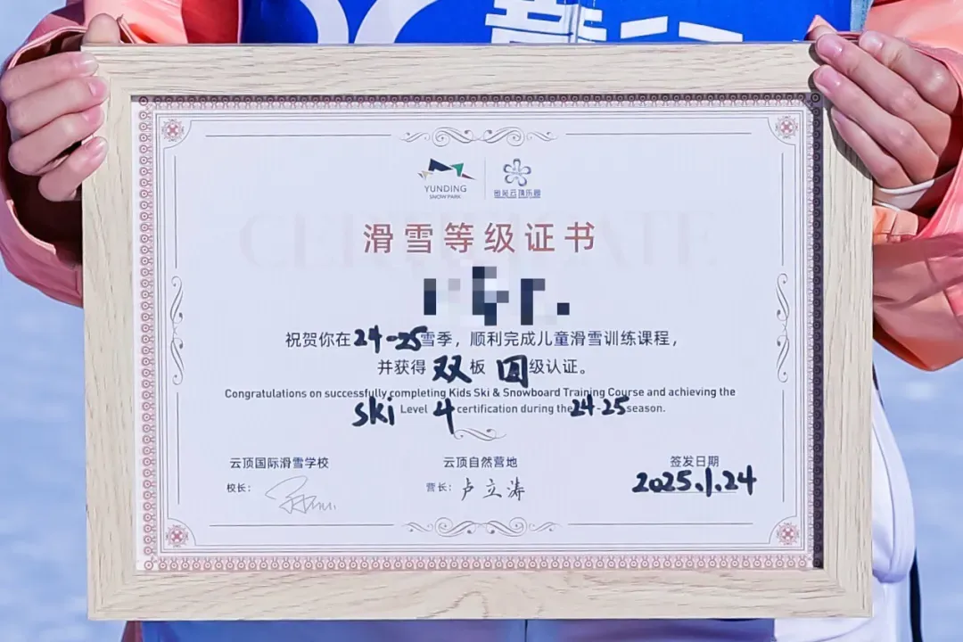 1.由云顶滑雪学校颁发的结营证书。证书等级根据北京市大众滑雪锻炼等级标准来判定滑雪等级(证书费用包含在报名费里)