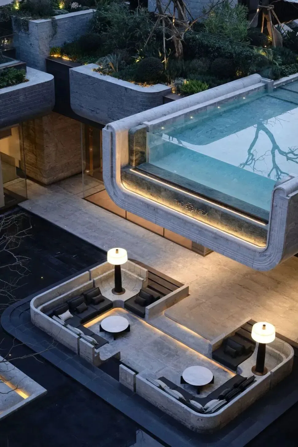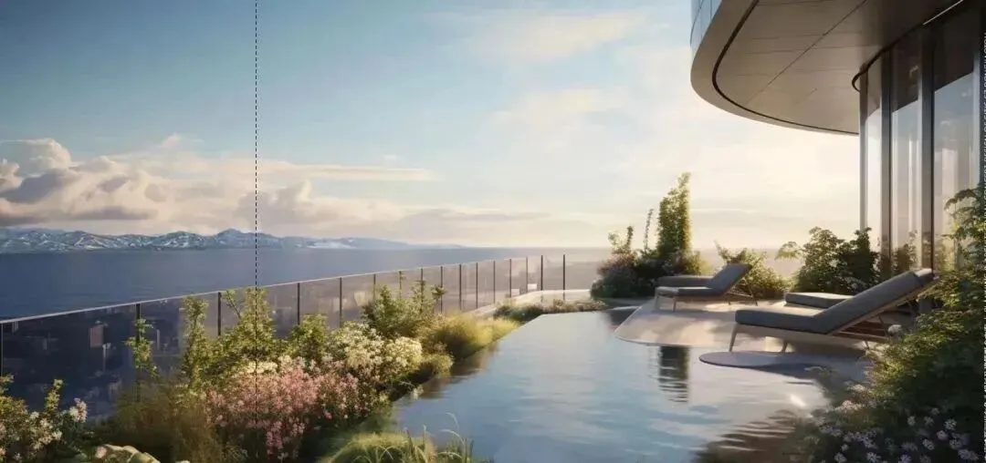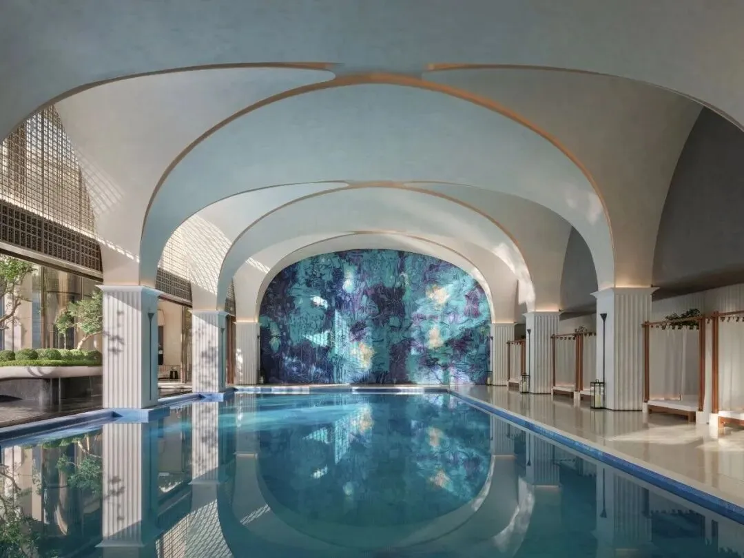 社区内规划400米艺术连廊,串联多元泛会所架空层,延伸全时社交空间。空中泳池悬挑于二层空中花园,以玻璃栏板切割天光云影,池底铺设艺术家手绘瓷砖,营造出“在星空下的画布上穿行”的视觉体验。