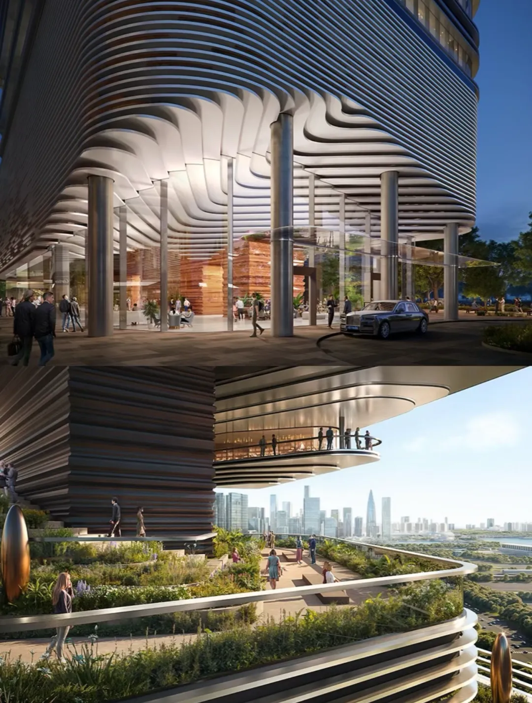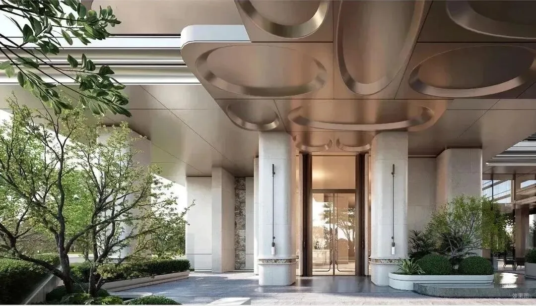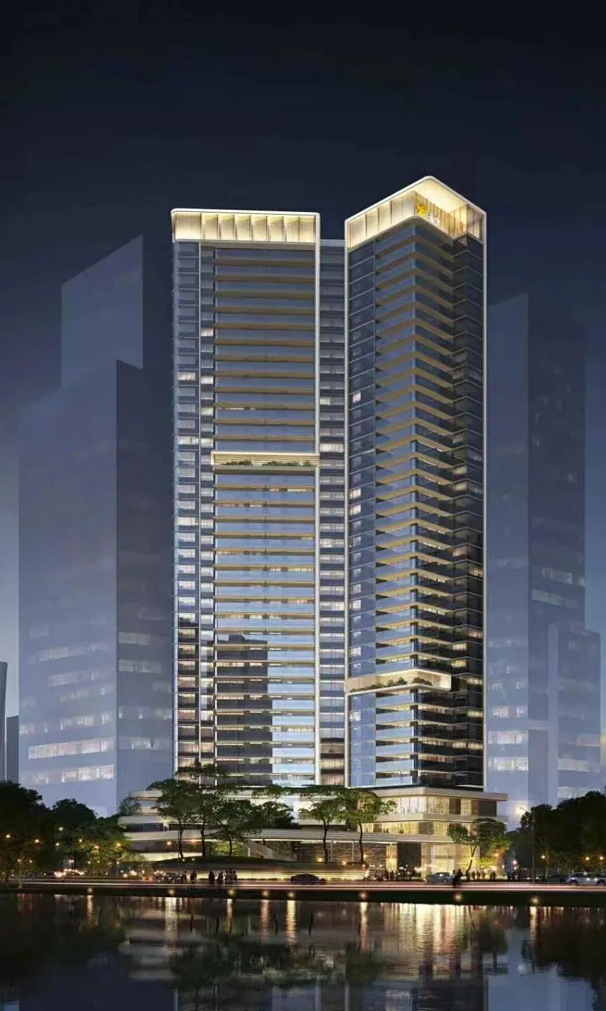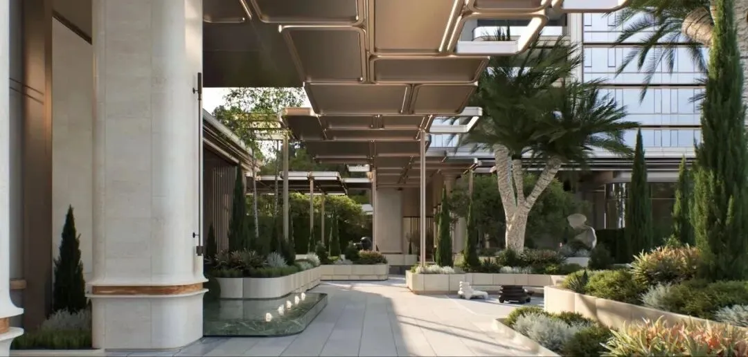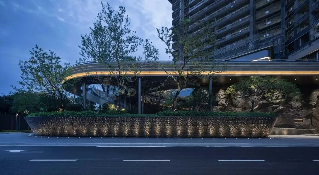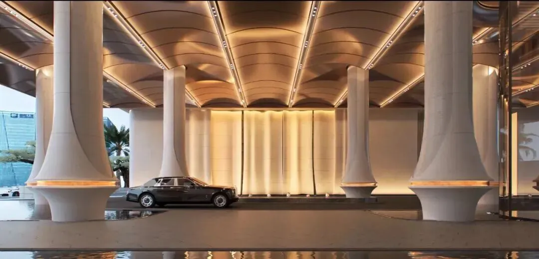 项目位于深圳后海豪宅区,2公里内串联深圳湾万象城、海岸城、后海汇等顶奢商圈。特邀世界前三结构顾问团队,打造“地下层-超级底盘-抬升甲板层-天空层”四层垂直浮岛体系,社区整体抬高12米,叠加8米挑高架空层泛会所空间,解决小地块空间局限,实现“上静下繁华”的生活质感。采用“海风百褶”立面语言,结合“揉石成缎”工艺,石材立面温润细腻,搭配米色与香槟金色铝板,营造轻盈动态美感。