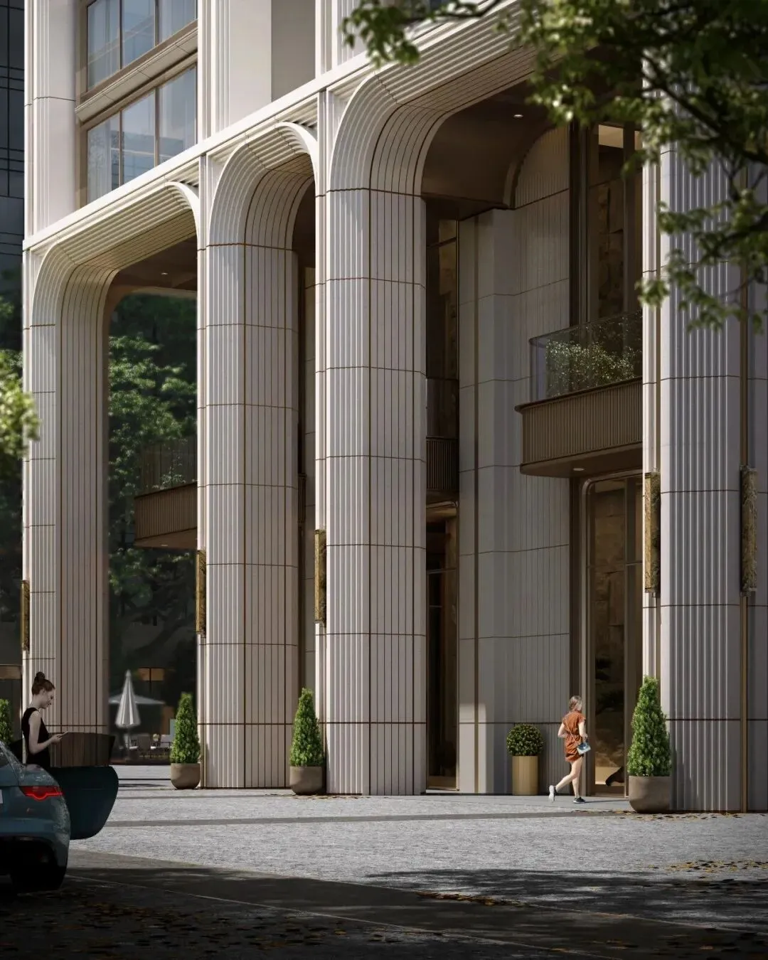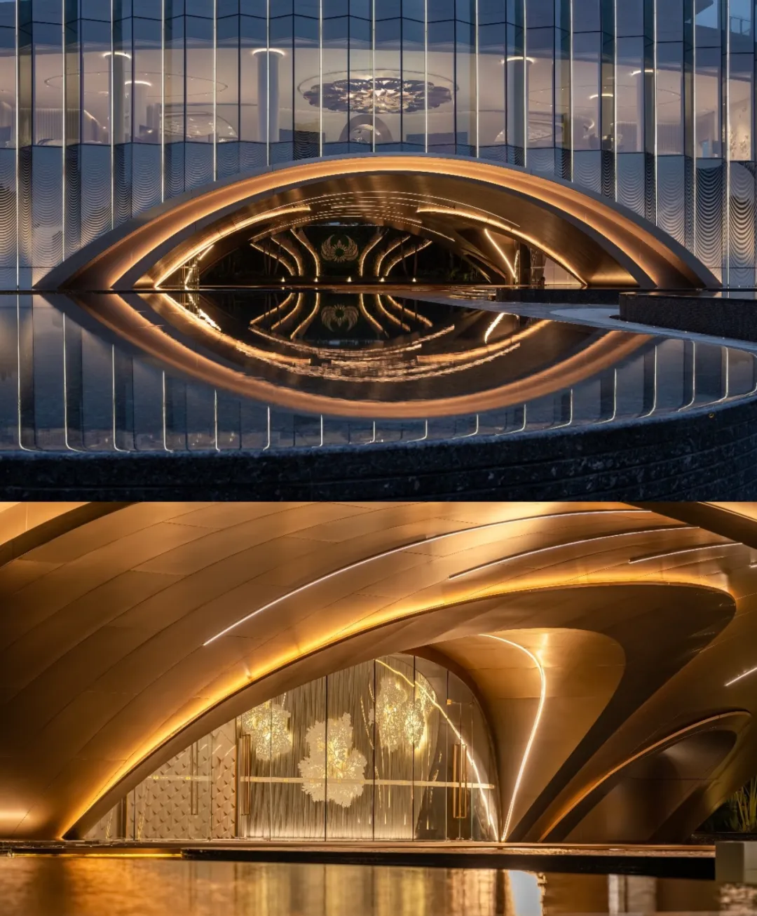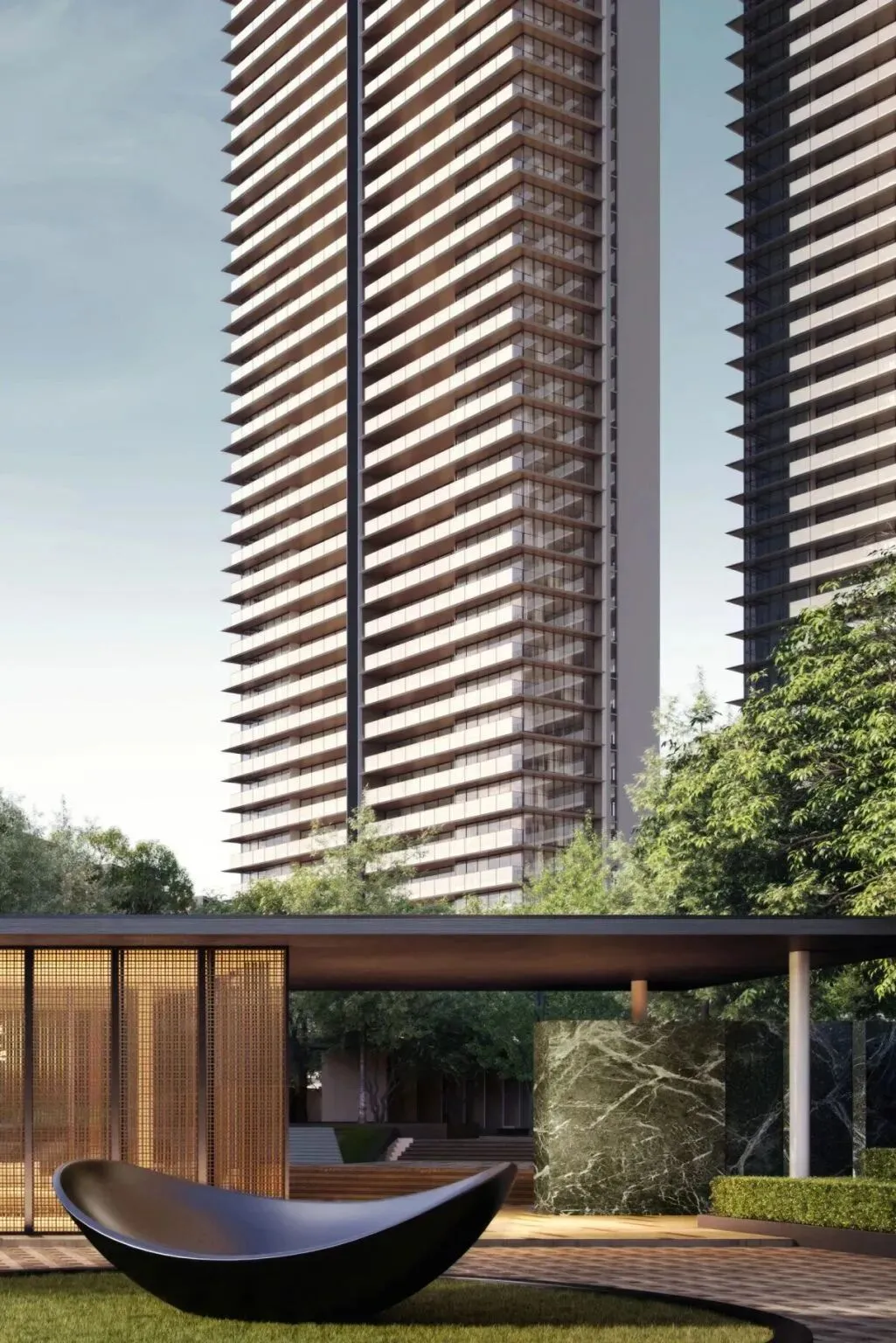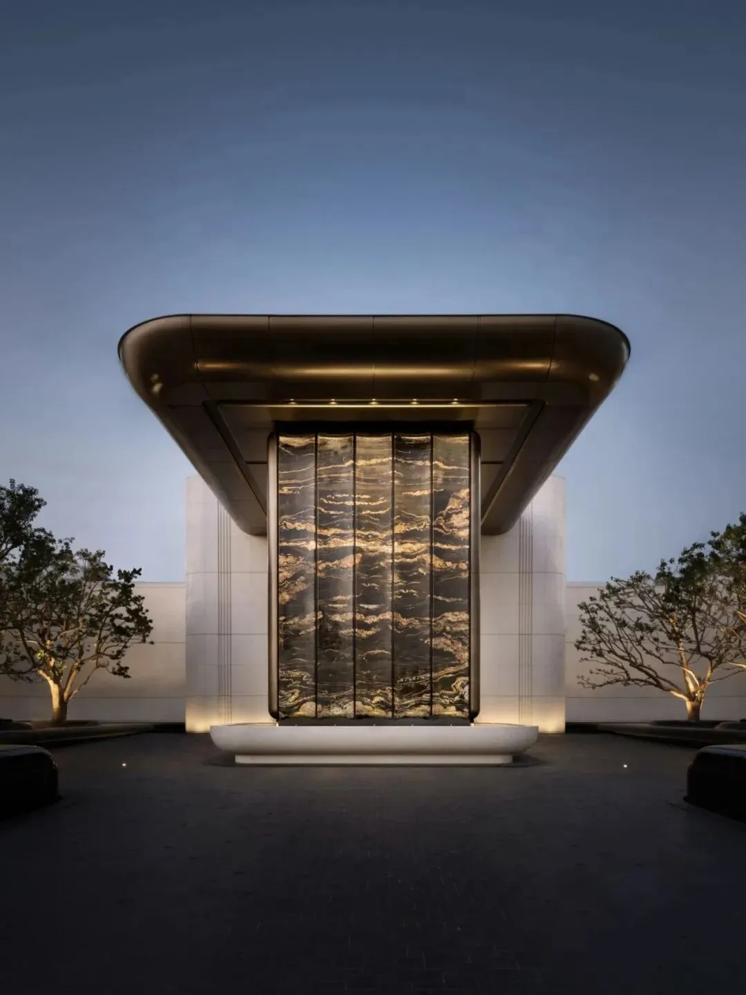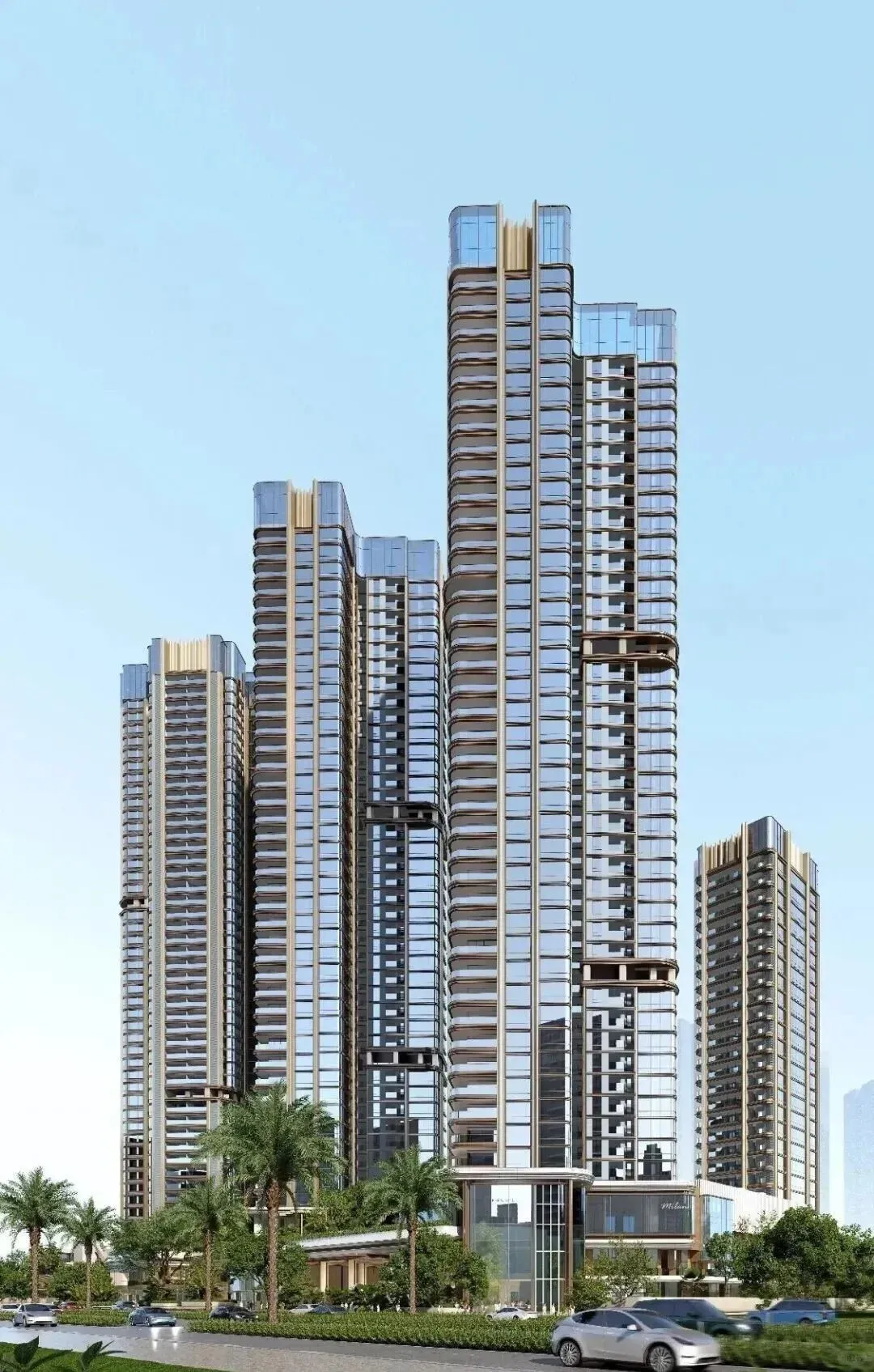项目位于深圳后海豪宅区,2公里内串联深圳湾万象城、海岸城、后海汇等顶奢商圈。特邀世界前三结构顾问团队,打造“地下层-超级底盘-抬升甲板层-天空层”四层垂直浮岛体系,社区整体抬高12米,叠加8米挑高架空层泛会所空间,解决小地块空间局限,实现“上静下繁华”的生活质感。采用“海风百褶”立面语言,结合“揉石成缎”工艺,石材立面温润细腻,搭配米色与香槟金色铝板,营造轻盈动态美感。