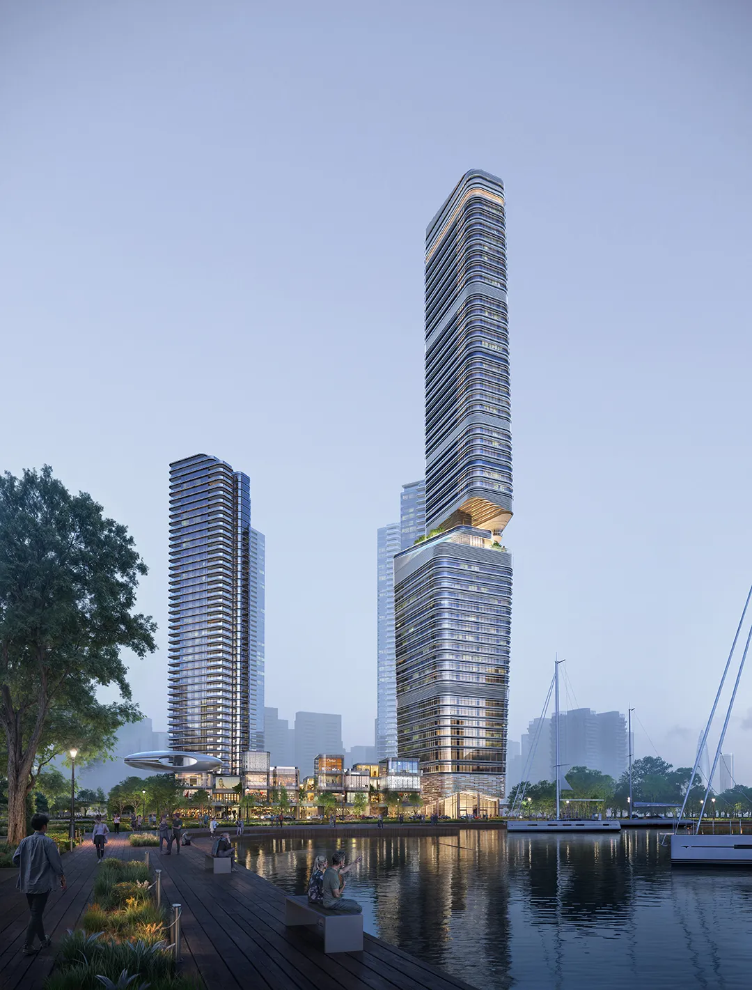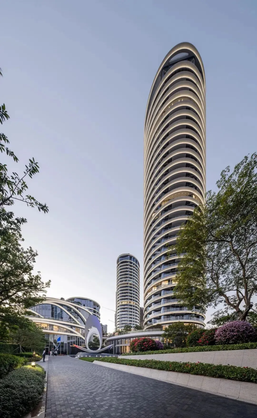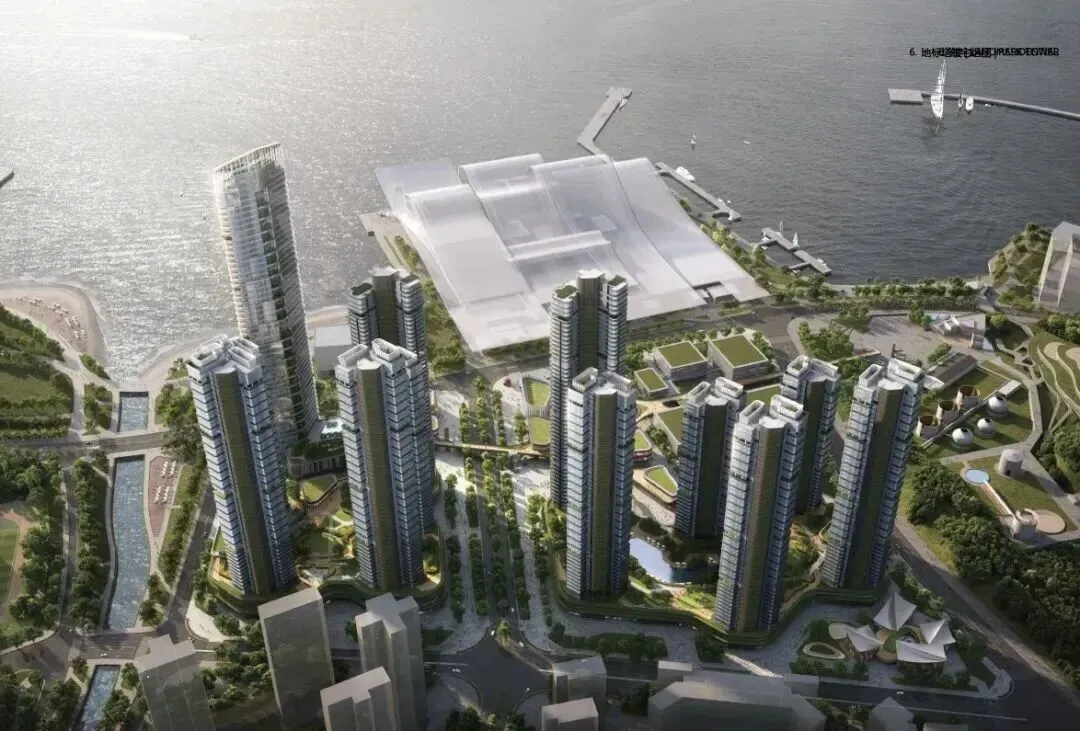建筑设计由KPF建筑总裁James von Klemperer亲自操刀,以自然为灵感,打造建筑立面如细胞般自然生长,塔冠顶部采用“微笑曲线”设计,强化建筑与湾区的融合。五座约150-250米的塔楼以“月牙抱海”姿态排布,高低错落,勾勒出优雅的微笑曲线,形成独特的城市天际线,辨识度极高。