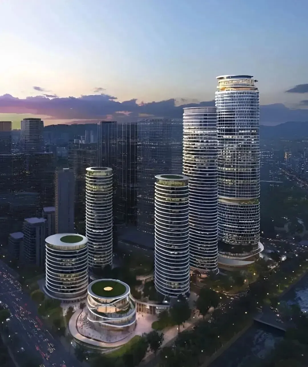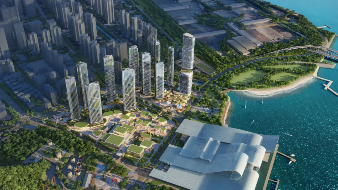 五座约150-250米的塔楼以“月牙抱海”姿态打造“地上三层、地下三层”的立体生态社区