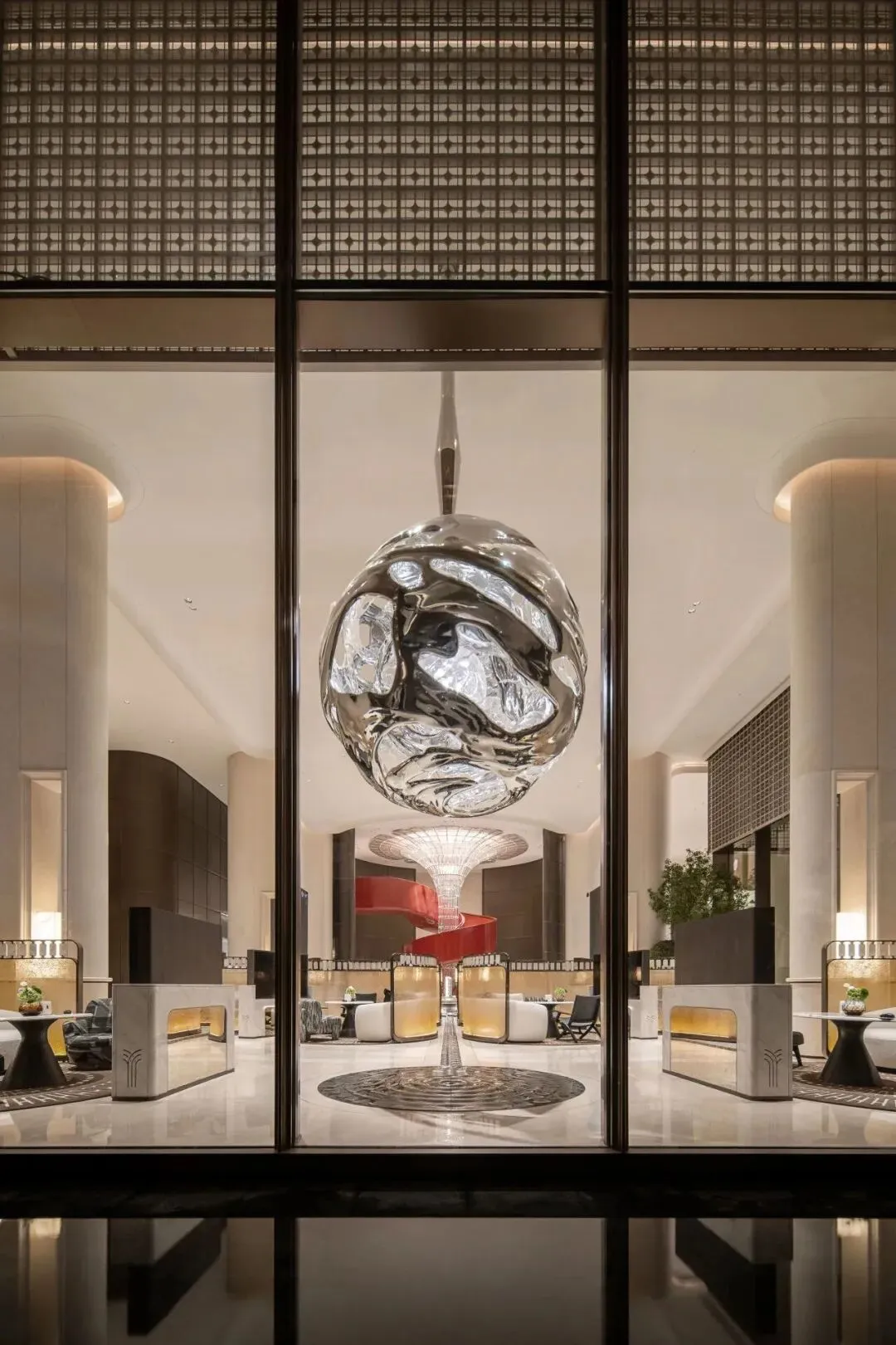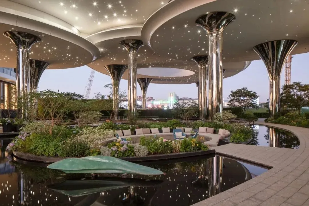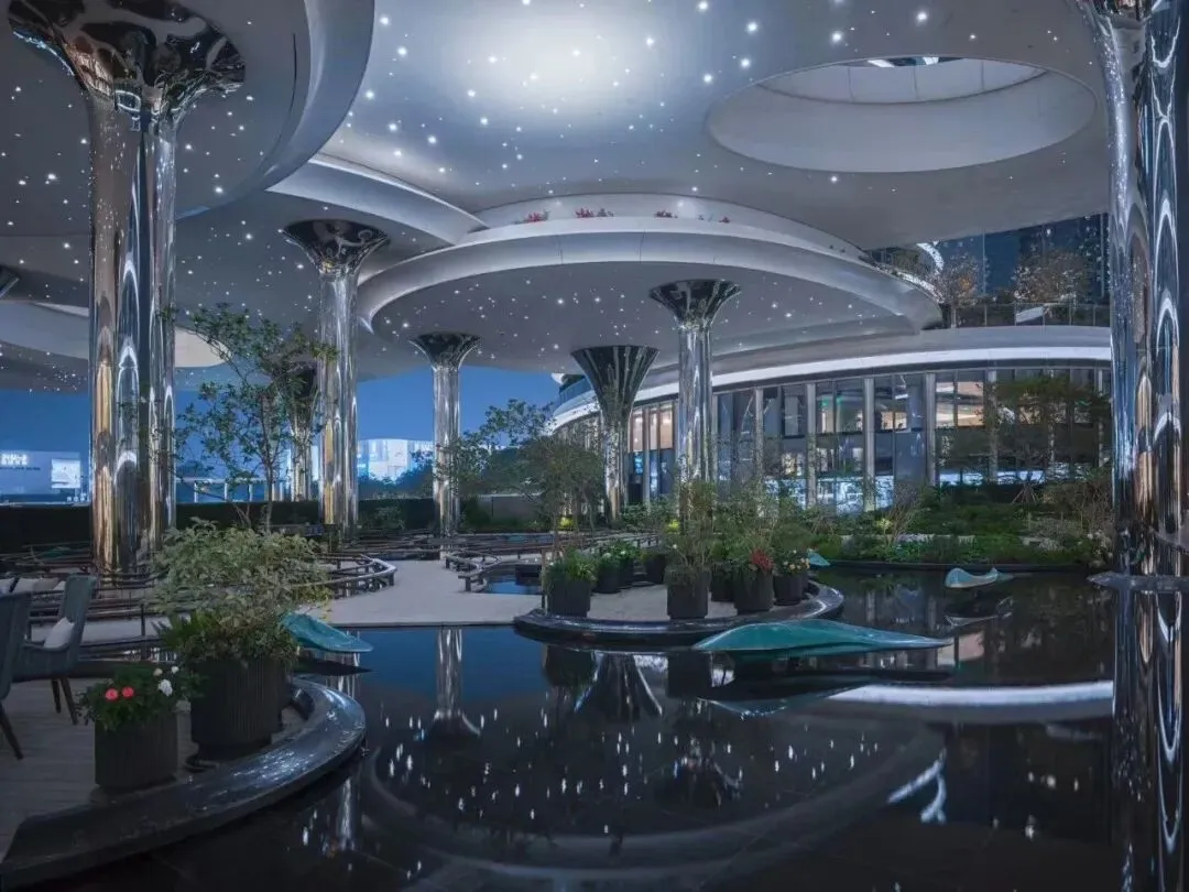 由AECOM设计的双层立体景观花园,包含1000平方米锦鲤池、星空顶、顶级艺术雕塑等,营造出“星河绮丽”的沉浸式自然体验。