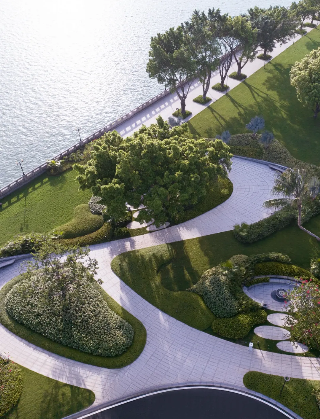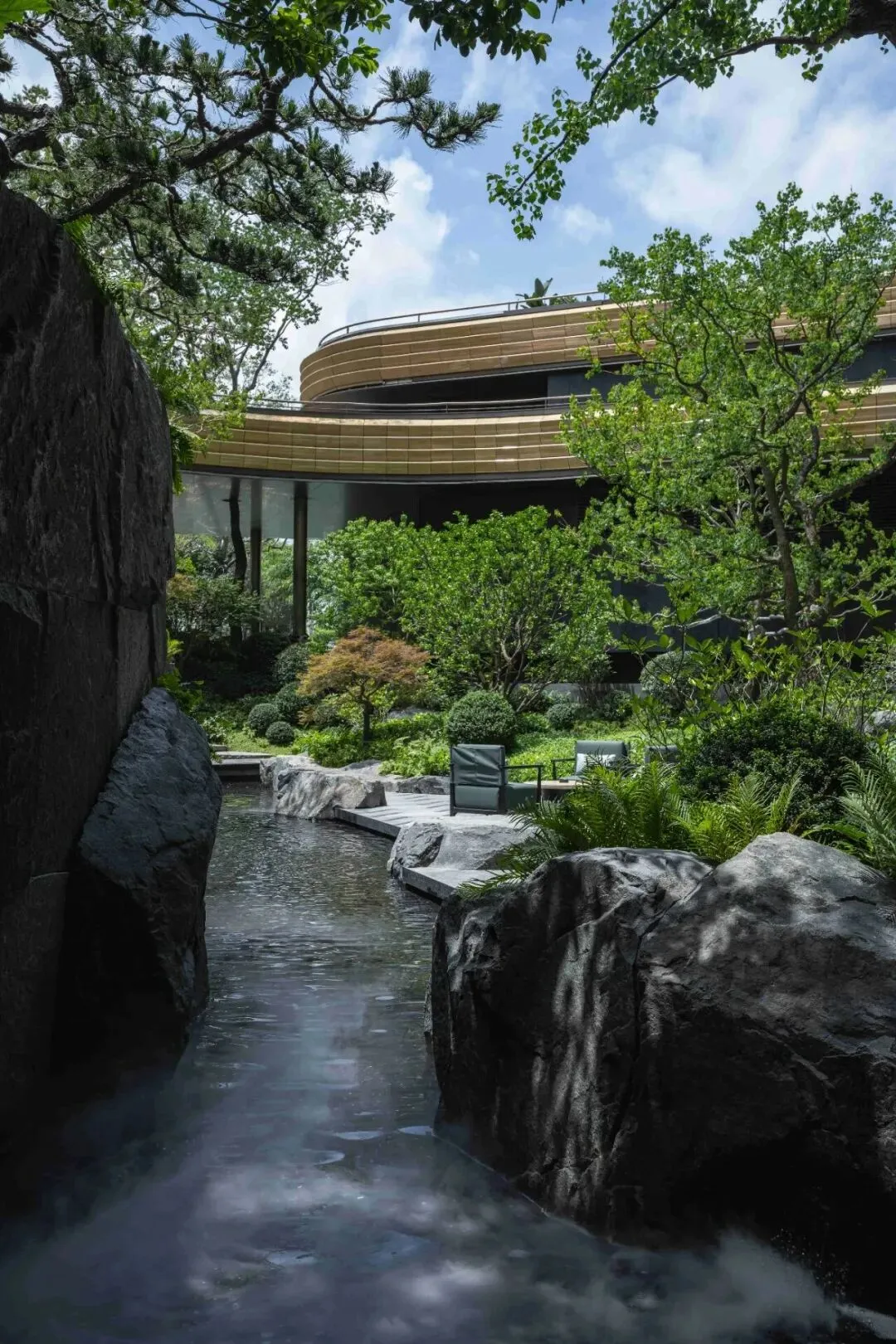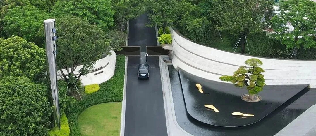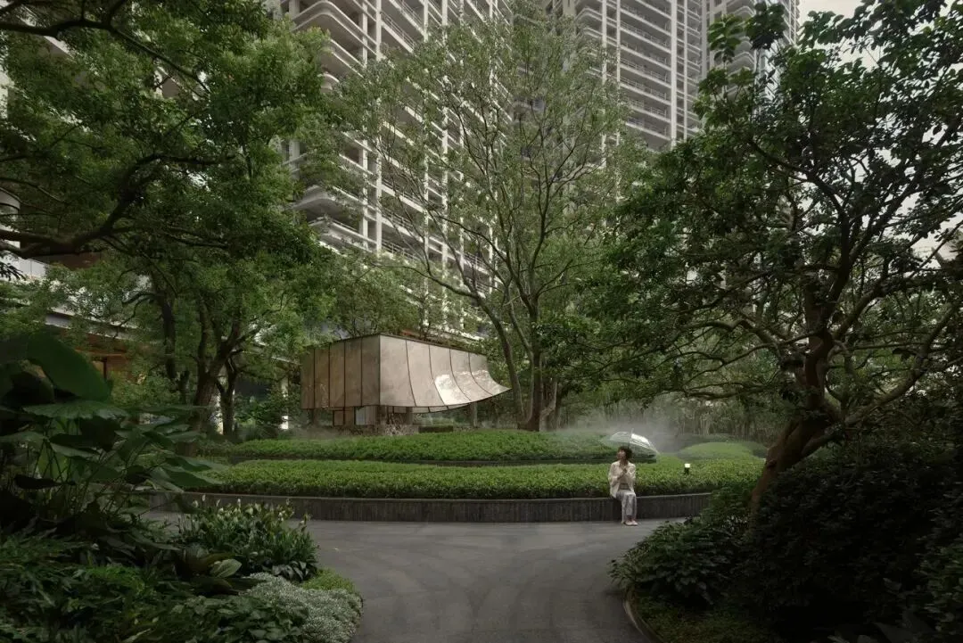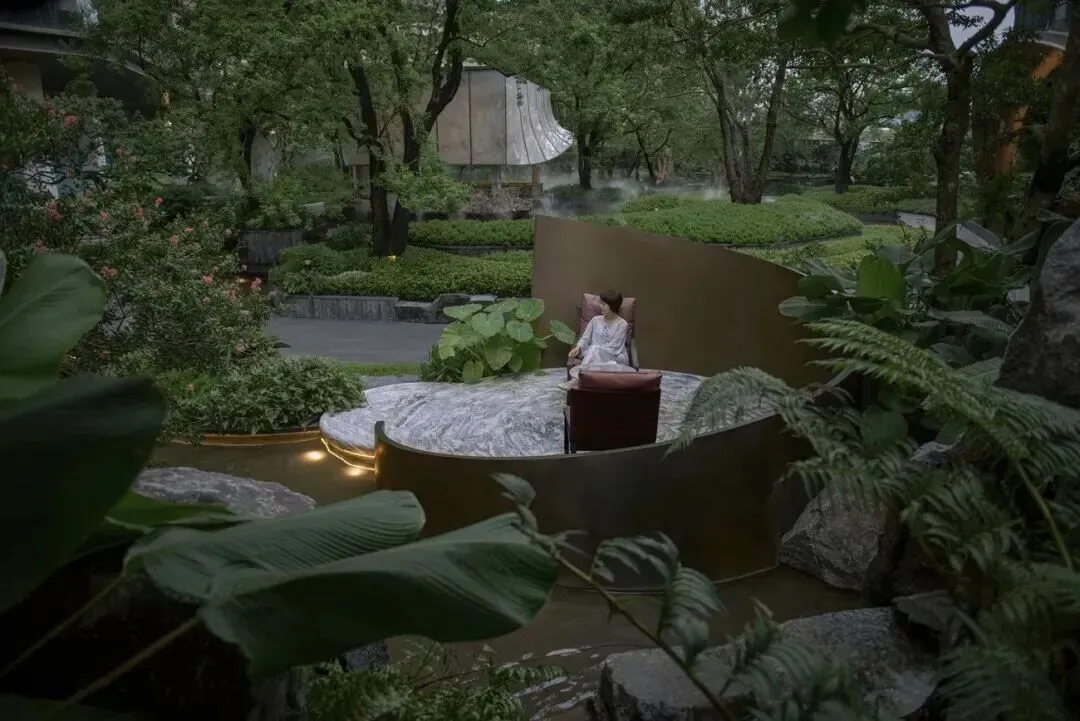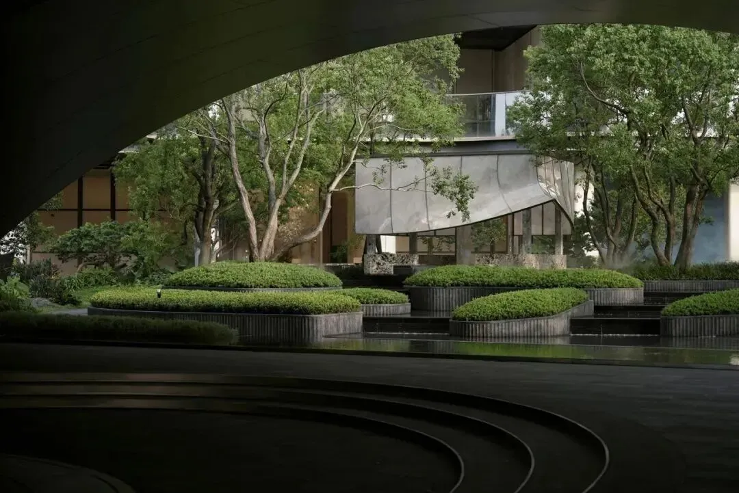 承袭格莱美园林理念,打造三级叠水立体园林,引入安哥拉黑奢石、库班灰奢石等高端材料,中央悬浮茶室以帆船造型漂浮于水池之上,结合古榕树、叠水瀑布、镜面水池等元素,营造松弛感十足的滨水度假氛围。
