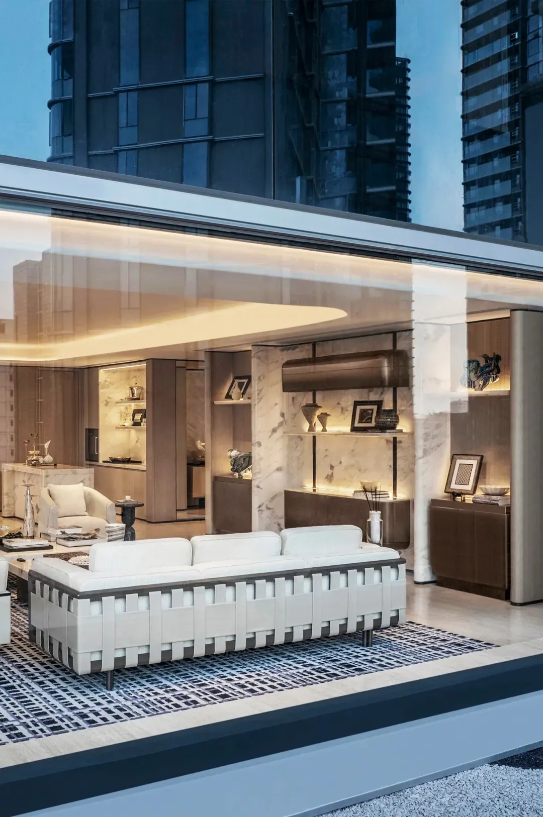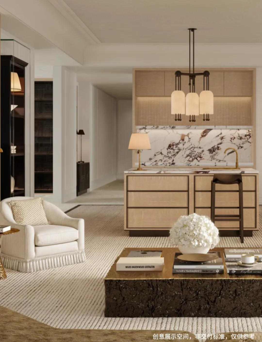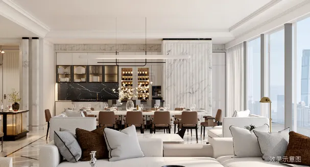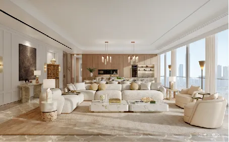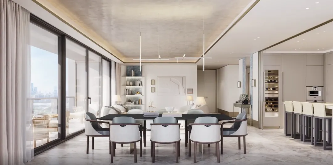 样板间室内设计由大师团队Yabu Pushelberg执笔,回归经典英伦风格,着重诠释绅士精神的云端生活体验。