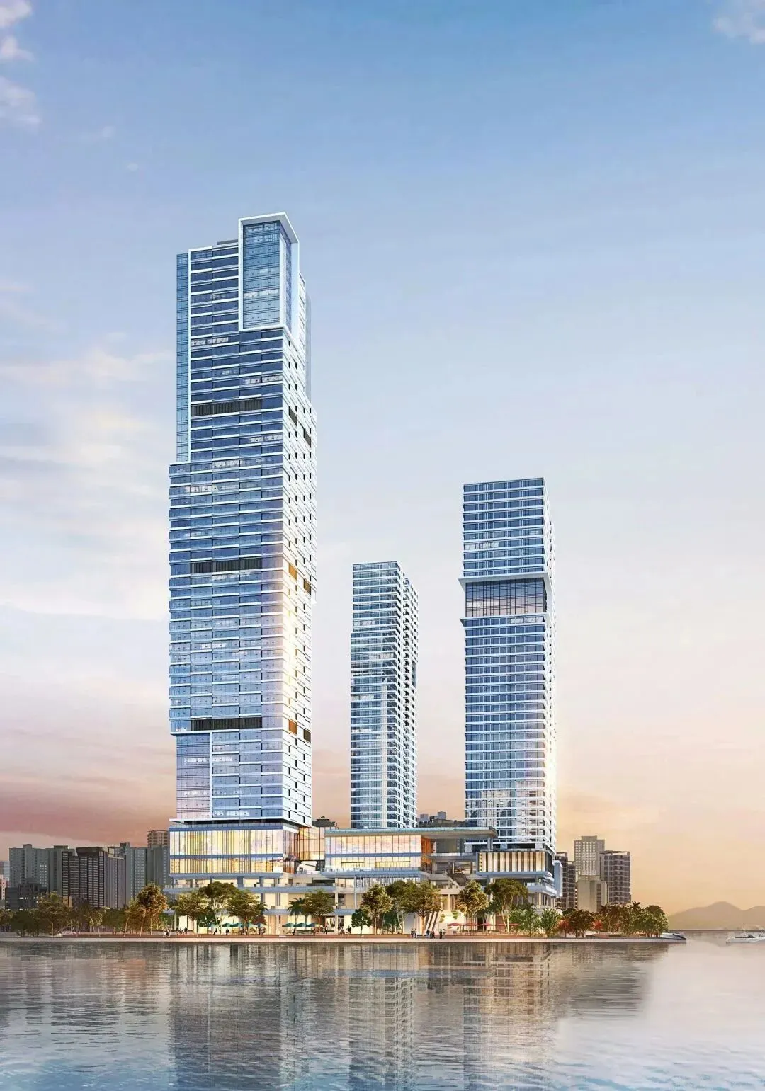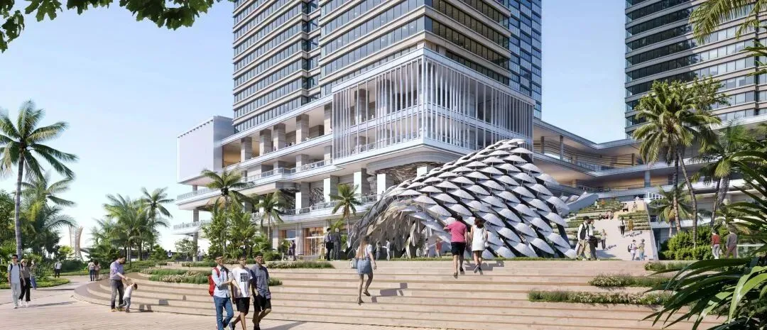 邀请德国gmp(建筑设计)、隈研吾(园林设计)、法国rfr(幕墙设计)、德国lkl(灯光设计)等全球10大设计团队参与,融合国际前沿设计理念,打造具有地标性的建筑作品。由三栋塔楼与商业裙房构成,涵盖办公、酒店、商业、居住等多元业态,形成250米高的垂直城市,折叠出海岸居住的丰富场景。
