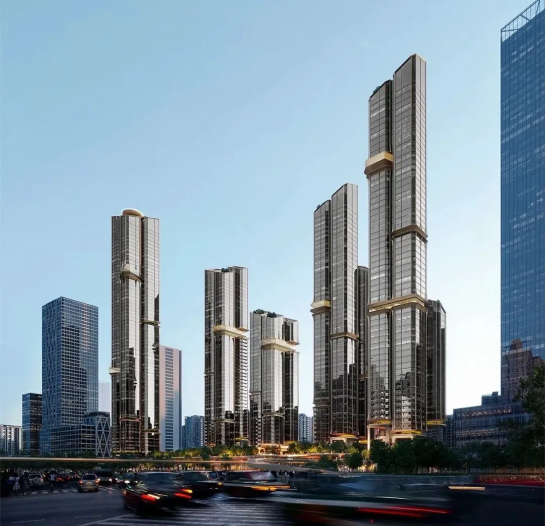 项目位于深圳湾超级总部基地核心区域,坐拥“海、湖、湿地、公园、高尔夫”五重生态资源。以3.0的低密容积率打造,以约9.2万㎡土地规划四栋超高层塔楼与两栋小高层搭配19套独栋别墅,形成东低西高的错落布局,总户数仅约300户。塔楼首层抬升至20米高空,释放立体公共空间,通过空中连廊与平台构建互联步行系统,实现建筑与自然的无界交融,呼应深超总“城市与自然共生”的规划理念。