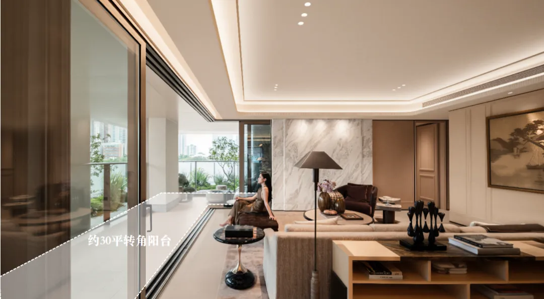 主力户型为300-1000㎡的总裁大平层,层高3.6-4.5米,搭配9.55米IMAX级阳台与3.7米宽幅玻璃幕墙。