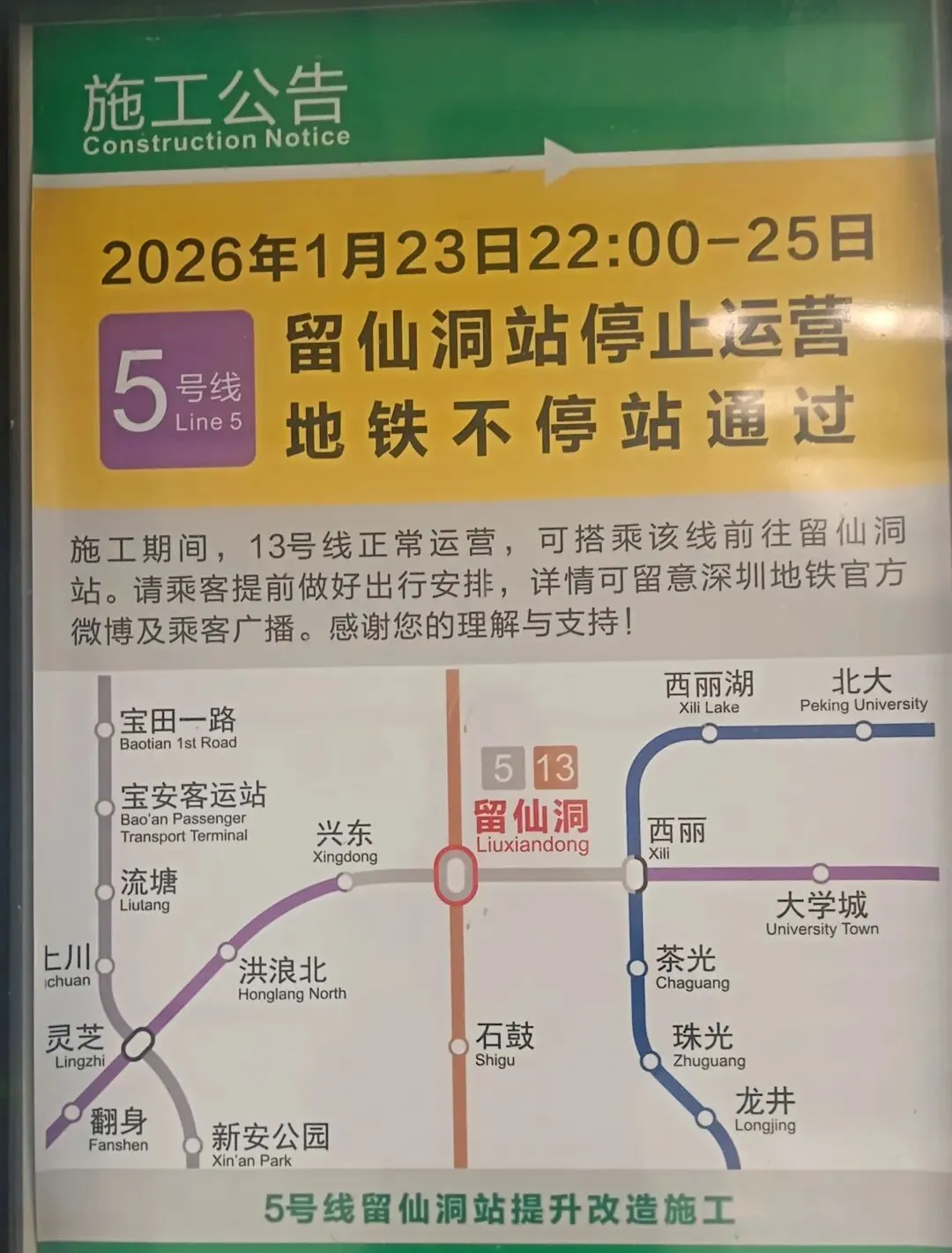 · 5号线 留仙洞站 将 暂停运营,列车 不停站通过。