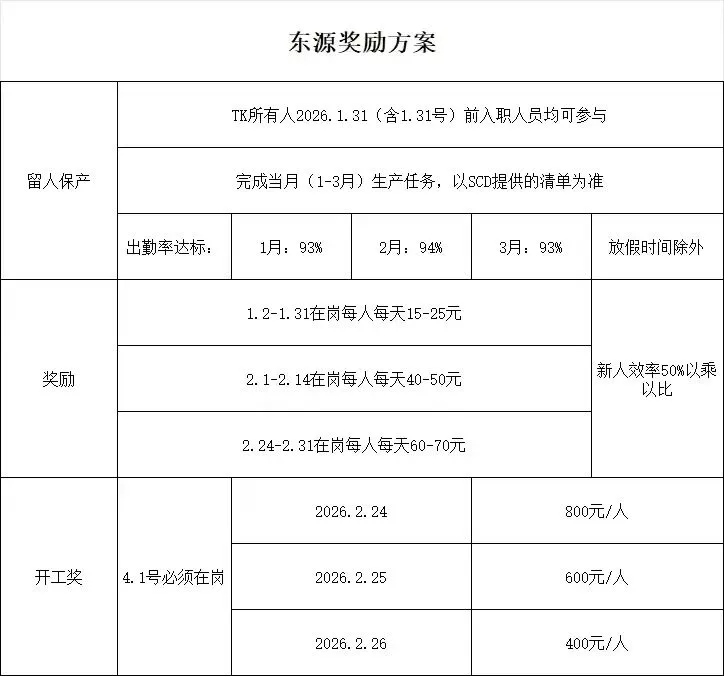 [红包]额外奖励15-70元/天,需要过年不离职的人员,放假大概9天,1、2、3月稳岗奖励综合2000-4000元左右