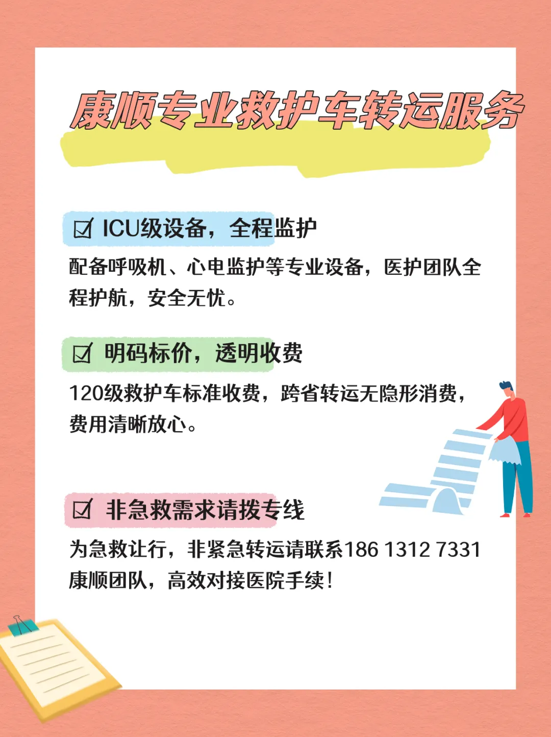 精准报价: 具体费用因距离、患者情况及所需设备而异,欢迎致电咨询获取精确报价。