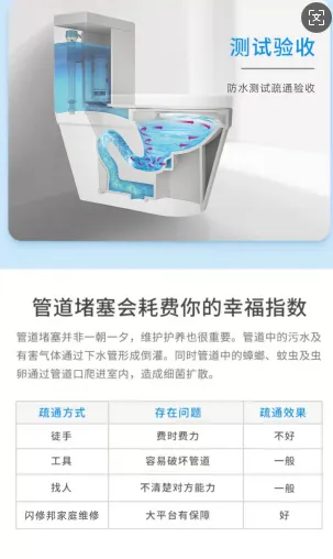 快速上门服务,十年管道疏通经验,让您无忧无虑!" 遇到管道堵塞,别再担心!我们团队拥有十多年的管道疏通经验,能够快速有效地处理各种管道问题。无论是厨房的排水管道、卫生间的下水道,还是商铺、工厂的排水系统,我们都能提供快速解决方案,确保问题得到及时处理。我们提供全国范围的服务,随时响应您的需求,不论您身处哪个城市,我们都能快速到达现场为您提供帮助。我们的团队技术精湛,设备先进,服务态度好,始终以客户的需求为导向,确保每一项服务都达到客户的满意。