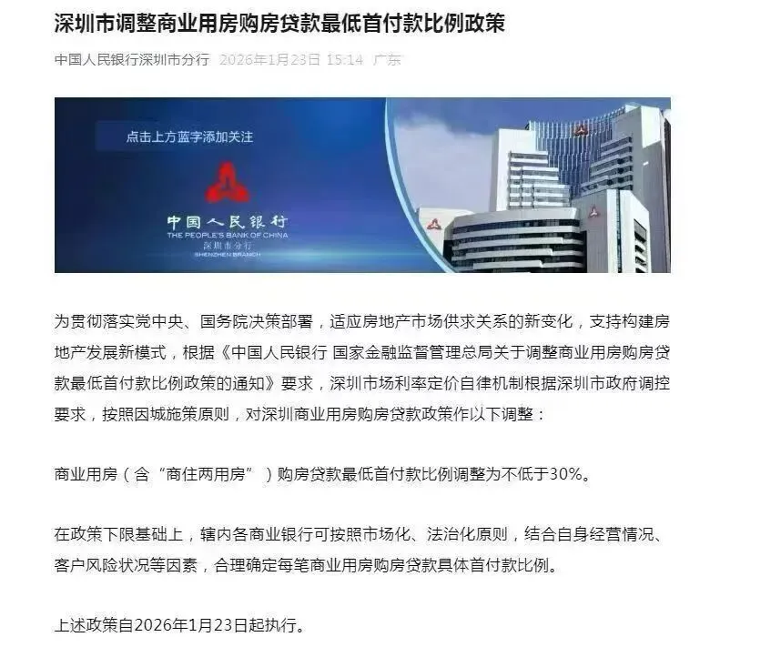 2026年1月23日起,深圳商业用房(含商住两用房)的最低首付比例,从原来的50%及以上,降至不低于30%!