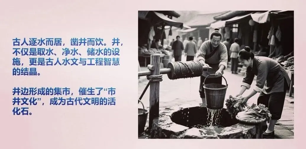 同时,井也成为墟镇发展的原动力。围绕着井便逐渐形成了商业和文化,正所谓:市井生活衍生出市井文化。因此,井既是水文化的记载和体现,站在更高的历史角度看,古井更是文明的体现。井边形成的集市,催生了“市井文化”。