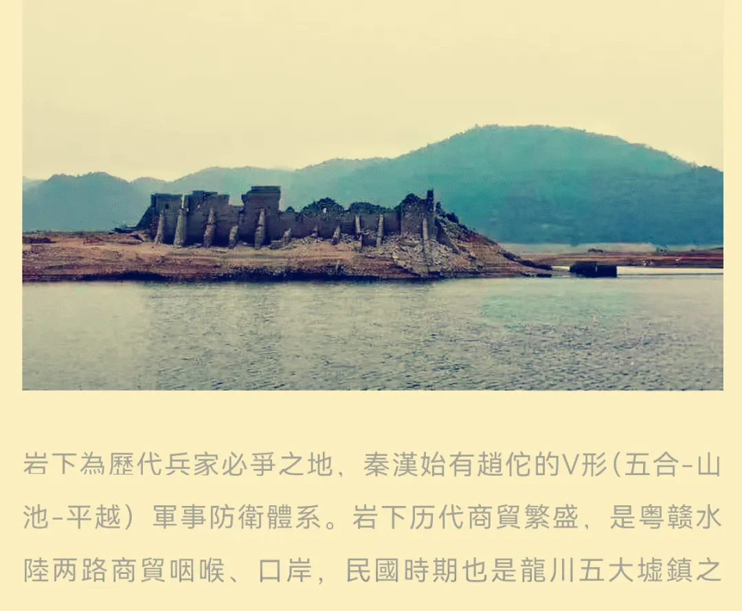 龙川,广东四大古邑之一,被誉为“秦汉岭南第一古镇”。龙川曾改名循州,两者均是东江水系上一个关键节点的命名。而循州之名与东江的古称循江有关。地理上东江二源流定南水与寻乌水在龙川县城上游的合河坝(现在的枫树坝库区内)汇聚成为东江,这个汇流点就是古时的岩下镇。