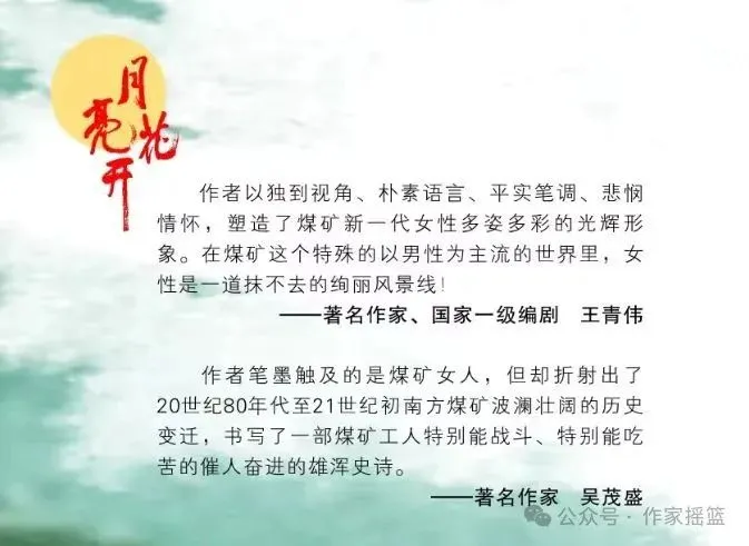 由作家王金星创作的反映煤矿女性题材、被列为湖南省作家协会重点扶持作品的长篇小说《月亮花开》,日前由国家著名出版社漓江出版社隆情出版。湖南读书会倾心打造,国家一级编剧家王青伟撰写序言,著名作家吴茂盛倾力推荐。