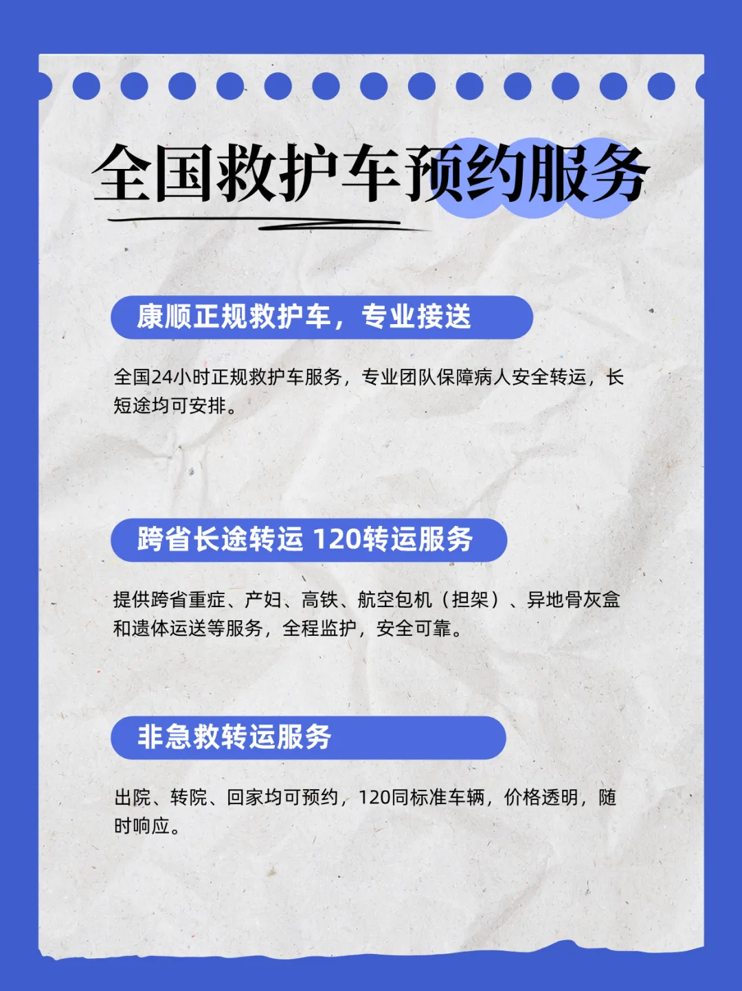 【私人120救护车(非急救)】服务涵盖多项场景,满足不同患者需求: