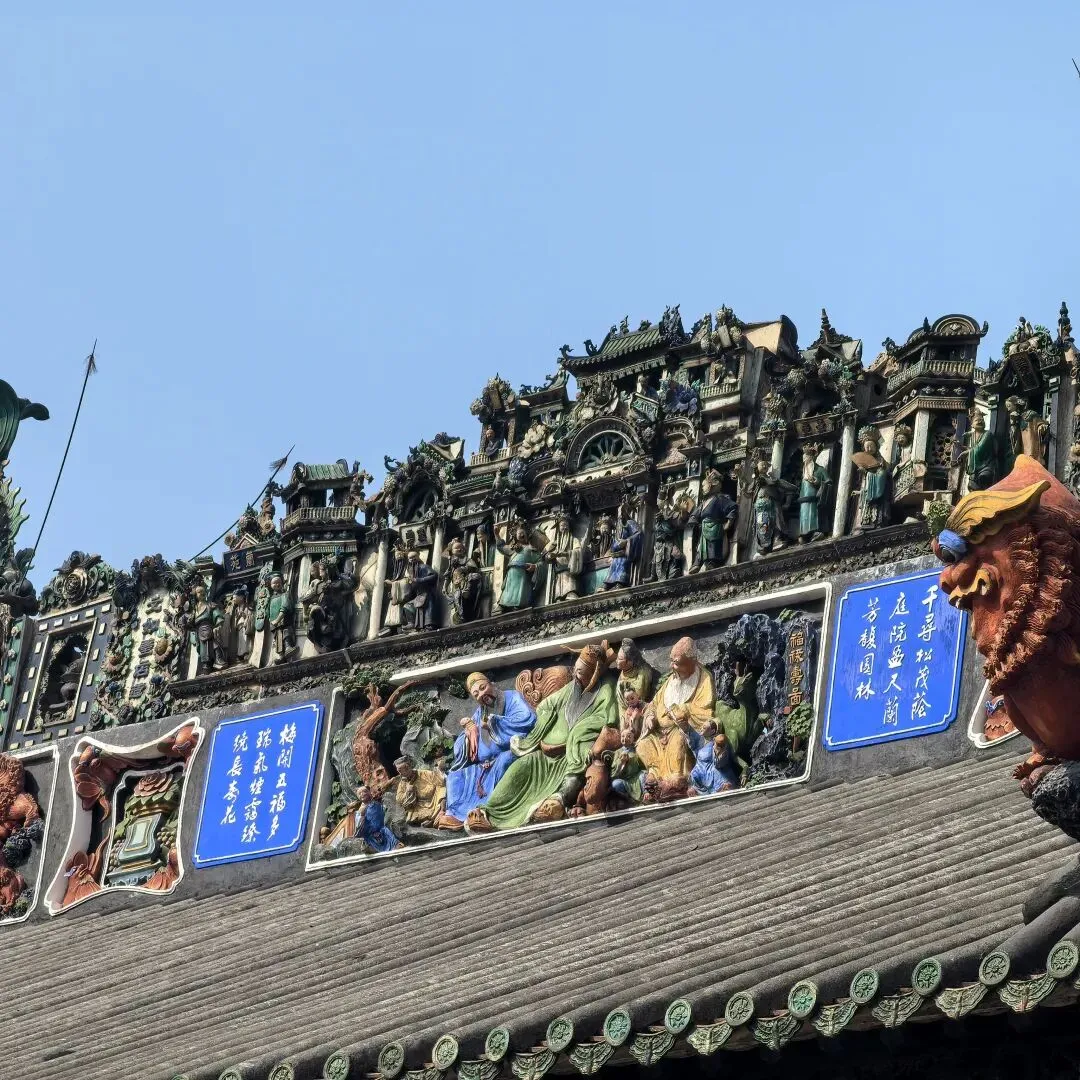 下图屋顶就有陶塑和灰塑。陶塑的是最高层骑楼样式。灰塑的是下一层的各种吉祥故事,灰塑类似于泥塑,材料有所不同。灰塑还需要定期上色,平均六七年就要上色一次。