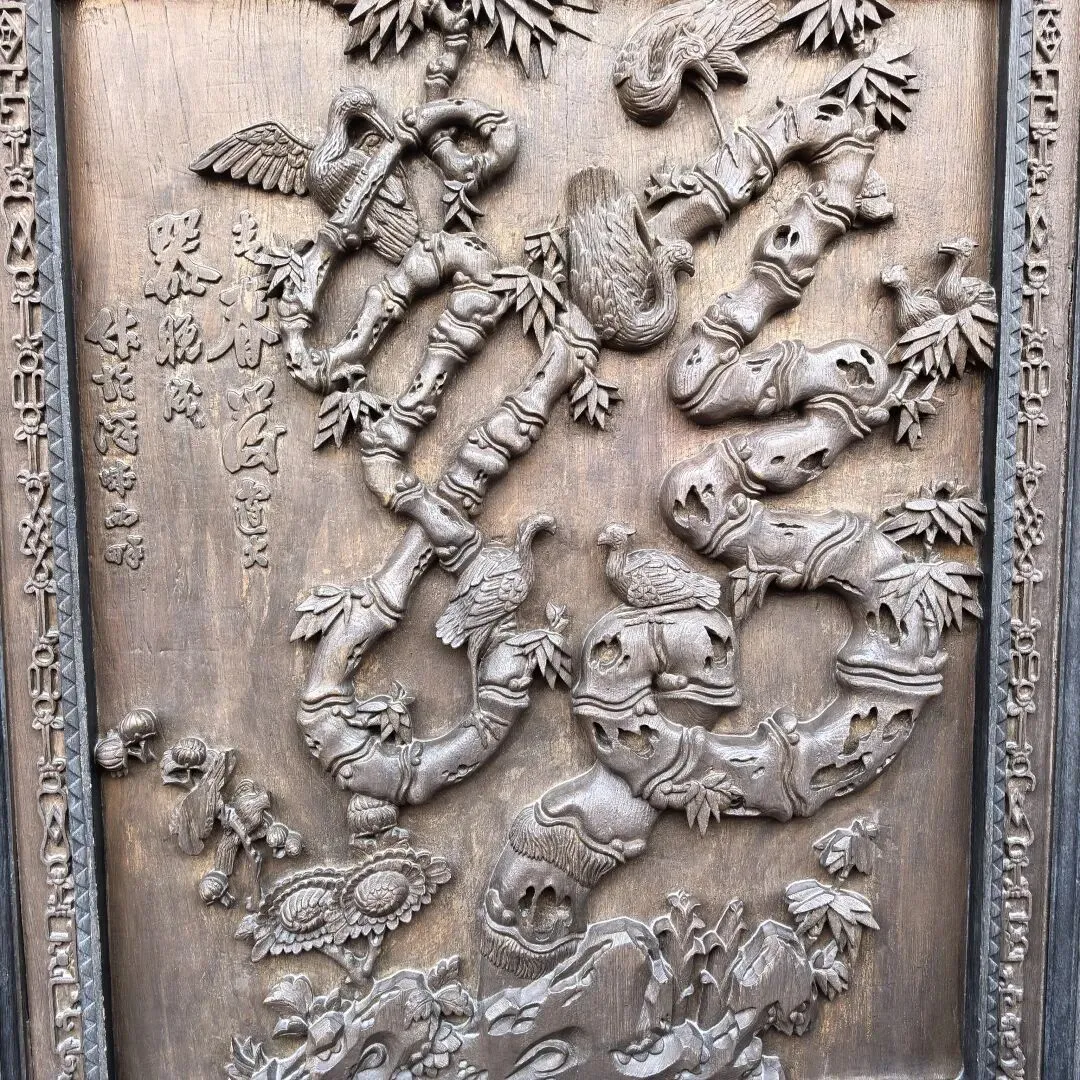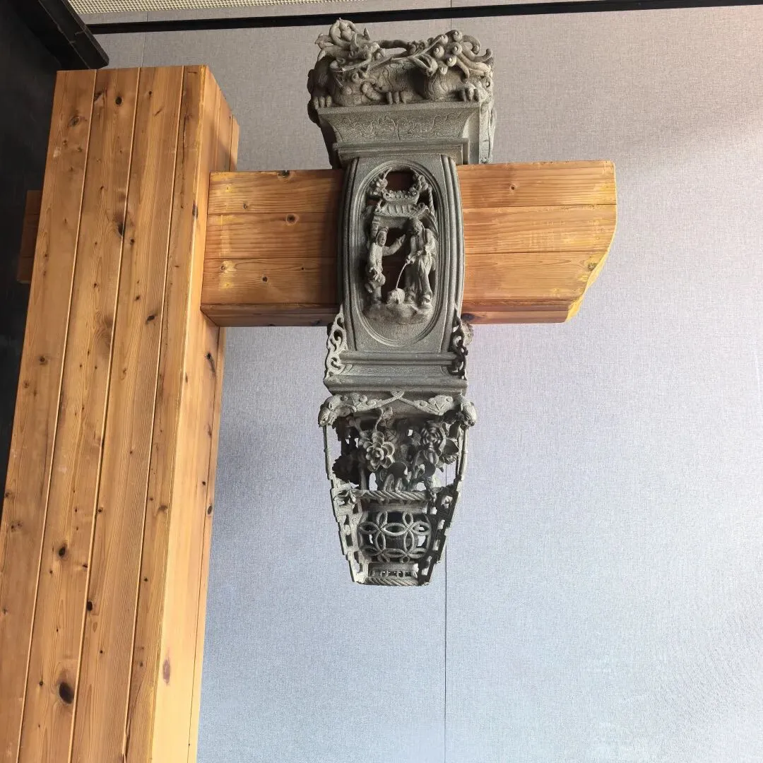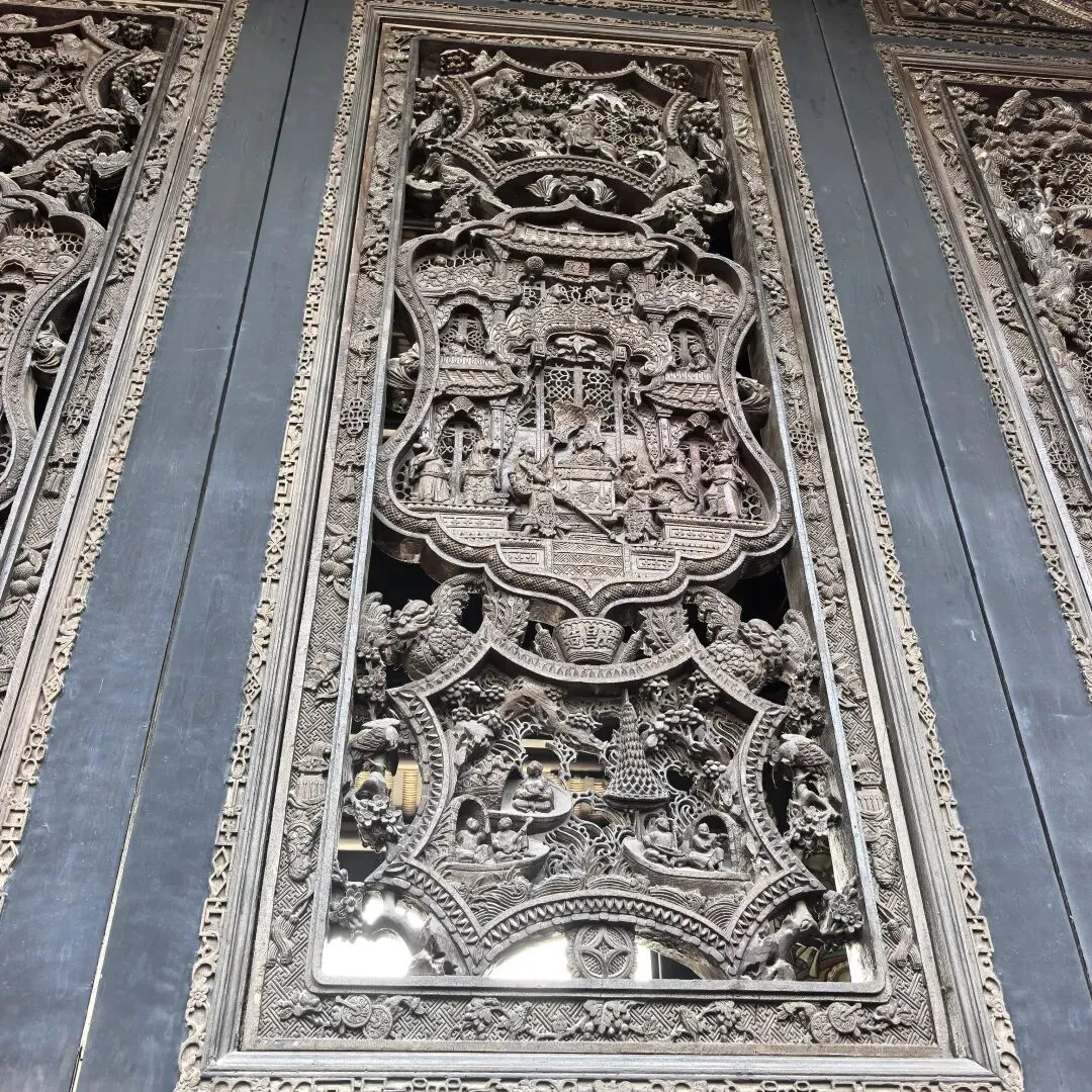 下面两张图都是木雕,很有代表性的图案。第一张是个“福”字,雕刻成老竹出新芽,意思是不要放弃读书,即便青春时候没有出人头地,你也可以大器晚成。同时“福”字还能拆开了看,左边像“多”右边像“寿”,也意味着多福多寿。下图是砖雕,由小块拼接而成。最下面是个铃铛,旁边是两个天使,这是陈家祠中西结合的证明。下图是石雕,但这个不是陈家祠的,陈家祠里的石雕比不上这个精美。这是征集来陈列在陈家祠的,中间部分是曾参杀猪的故事,曾参手里牵着小猪,那跟绳,也是石头的,整块石头雕刻出来的这么个作品,仅仅是个垂花门斗。有钱就是不一样啊~铜铁铸没有照片,院墙里的铁柱子,大门轴下的铜基座……