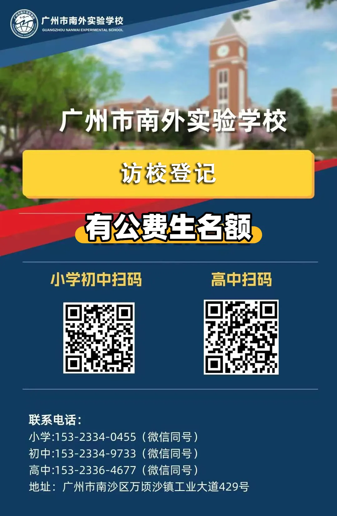 温馨提醒:2025年秋季招生工作已收官,2026年春秋季招生咨询已开启,目前招办每天开放小初高和各年级插班生升学咨询,海报上有电话,也可扫码登记探校,探校时间非常灵活:可以周中、可以周末,可以专场,时间可以自由选择。