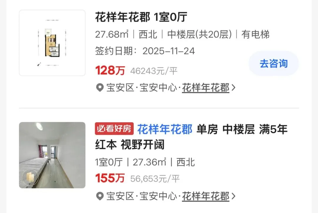 宝中网红盘花样年花郡。此前跌得最狠的28平单间,成交价一度跌到128万,如今同户型最低挂牌155万。当有客户尝试以132万谈判时,中介直接拒绝:“这个价格根本不可能,业主不会卖的。”