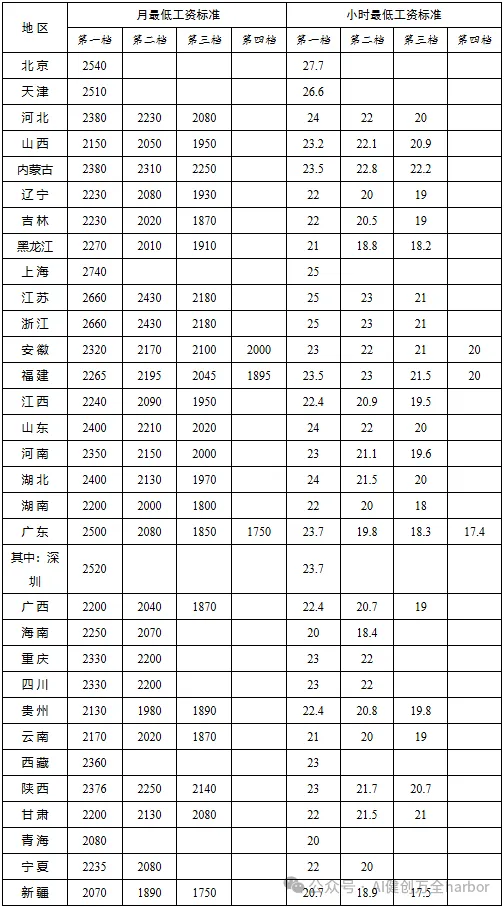 月最低工资标准分别为