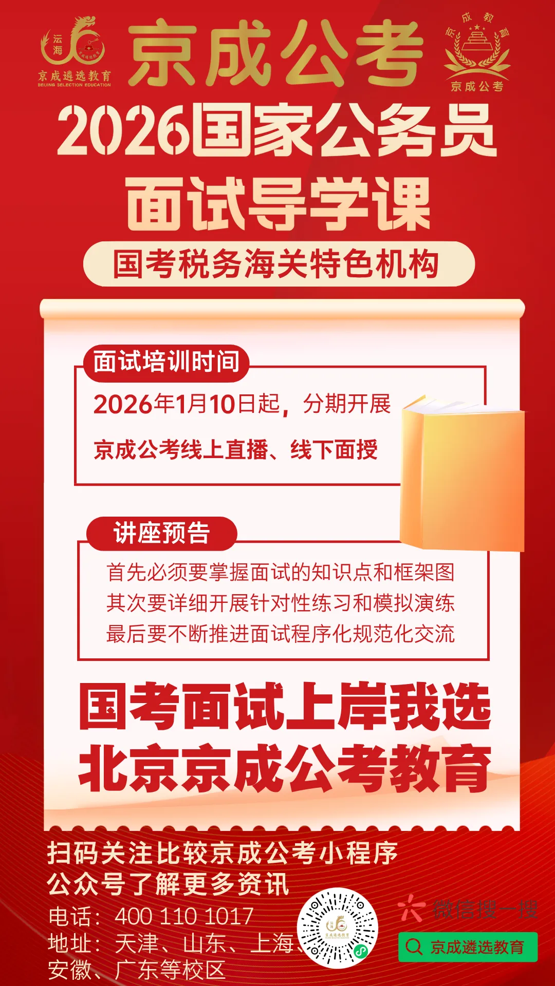 京成公考国省考面试套餐最新版主要包括以下几种班型,不同班型在价格、服务内容和保障措施上有所差异:内容:包含线上导读学习+线下面试学习7+3天(包住宿)+N天线上集中复盘练习至考前。特点:适合对价格敏感、希望自主安排学习进度的学员,提供基础的课程学习和模拟演练服务。内容:包含线上导读学习+线下面试学习7+3天(包住宿)+N天线上集中复盘练习至考前。特点:提供岗位保护服务,学员可选择先交6980元,进入体检环节后补交剩余费用(小围补交10000元,大围补交12000元),或一次性缴纳16980元。若未通过面试,可选择退费或转为第二年笔面一体全年班。3. 0元先学协议班价格:学习期间不缴纳费用,进入体检公示环节后,小围补交19980元,大围补交25980元。内容:包含线上导读学习+线下面试学习7+3天(包住宿)+N天线上集中复盘练习至考前。特点:适合经济压力较大但对岗位有强烈需求的学员,降低前期学习成本,但需在后续环节承担较高费用。以上套餐均采用“7+3+N”讲练模式,即7天固定课程+3天自由练习续住+ N天线上集中复盘练习,确保学员有充足时间巩固知识、提升实战能力。具体班型选择可根据个人经济状况、报考岗位竞争程度及学习需求综合考虑。海关面试早已告别“模板化答题”时代,唯有“懂政策、熟实务、会沟通”才能脱颖而出!