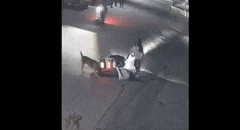 只见外卖小哥骑着电瓶车毫不犹豫地冲向恶犬,吓得它一个闪退,女子趁机起身,准备逃脱。