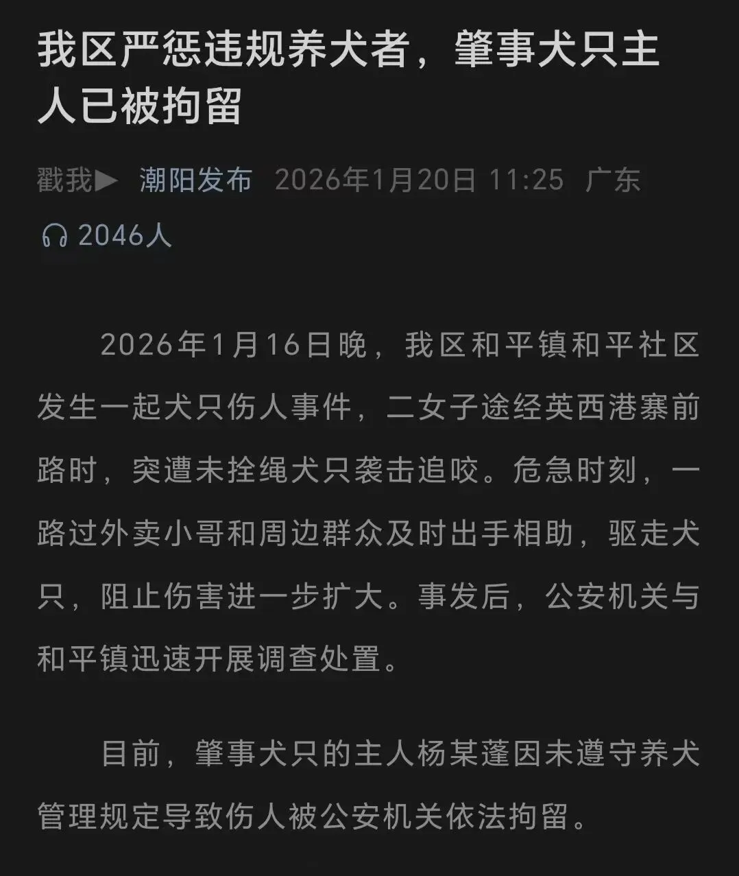 几天后,在1月20日中午,汕头市“潮阳发布”官方通报了此事,确认肇事恶犬是当地家养犬,狗主人已经被依法拘留。