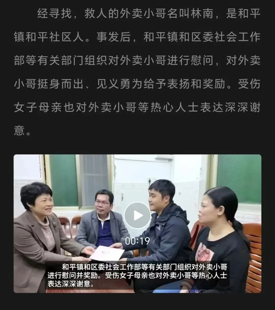 二是见义勇为的外卖小哥好人有好报,被官方予以表扬和奖励。
