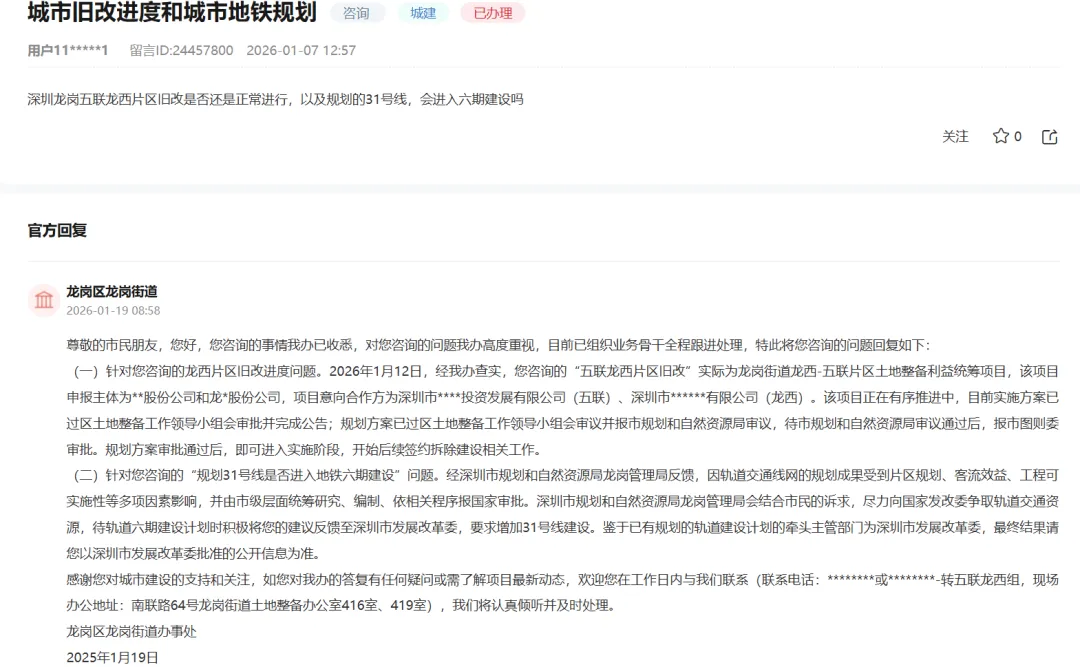 近日,有五联龙西片区市民咨询城市旧改进度和城市地铁规划。提到深圳龙岗五联龙西片区旧改是否还是正常进行,以及规划的31号线,会进入六期建设吗? 对此,龙岗街道办回复表示尊敬的市民朋友,您好,您咨询的事情我办已收悉,对您咨询的问题我办高度重视,目前已组织业务骨干全程跟进处理,特此将您咨询的问题回复如下: (一)针对您咨询的龙西片区旧改进度问题。2026年1月12日,经我办查实,您咨询的“五联龙西片区旧改”实际为龙岗街道龙西-五联片区土地整备利益统筹项目。该项目正在有序推进中,目前实施方案已过区土地整备工作领导小组会审批并完成公告;规划方案已过区土地整备工作领导小组会审议并报市规划和自然资源局审议,待市规划和自然资源局审议通过后,报市图则委审批。规划方案审批通过后,即可进入实施阶段,开始后续签约拆除建设相关工作。 留用土地06-10地块面积30234.1平方米,规划为二类居住用地+商业用地,规划容积率7.8,总建筑面积234438平方米,其中居住建筑面积153207平方米、商业建筑面积75101平方米(含母婴室135平方米)、公共配套设施6130平方米(含12班幼儿园3960平方米<占地面积3600平方米>、社区菜市场1500平方米、社区警务室100平方米、公共厕所120平方米、环卫工人作息房20平方米、社区管理用房300平方米、通信机房70平方米、变电所60平方米);
