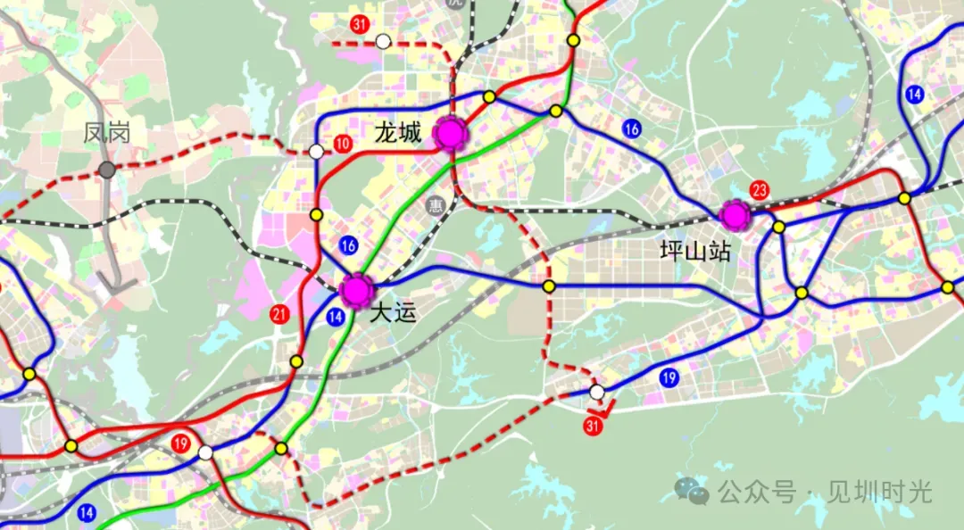 深圳地铁31号线:承担提升龙岗中心南北向轨道联系,增加五联、宝龙科技园及碧岭片区联系,应对未来城市发展弹性的功能。规划线路自龙岗五联经龙城枢纽、宝龙工业区至碧岭片区,并预留北延至东莞凤岗、南延至盐田的条件考虑该线路主要为应对未来城市发展弹性,建议为弹性发展线路,全长约14.9公里。